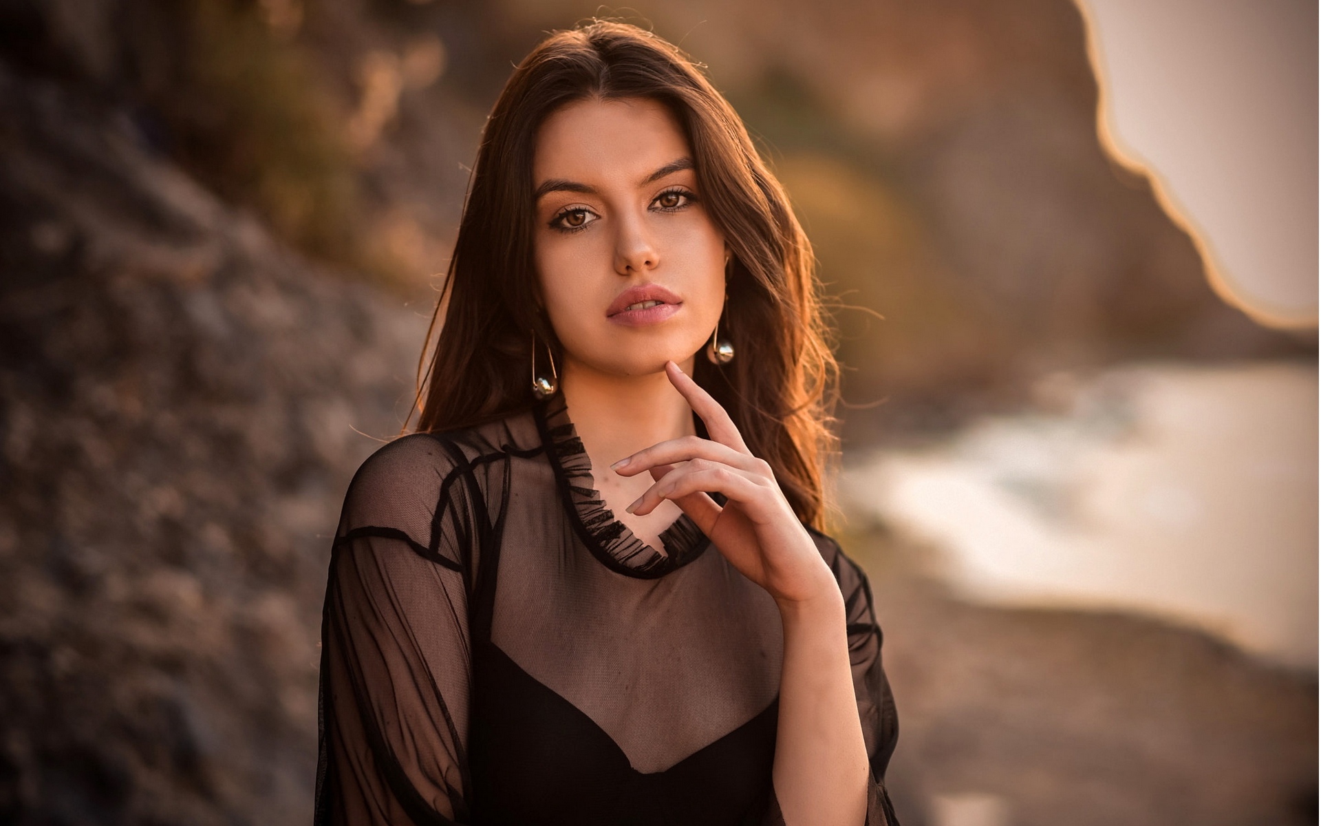 Description: A woman posing for a picture in front of a cliff and ocean with her hand on her chin and her hand under her chin.