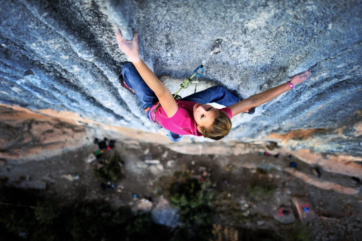 Description: A woman climbing up a rock face down on a rock face down.
