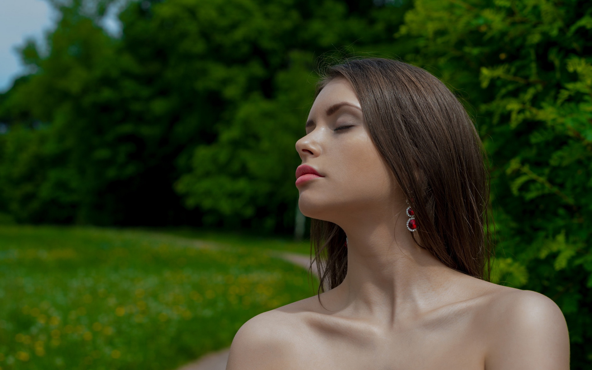 Description: A woman with her eyes closed standing in a field of grass and trees.