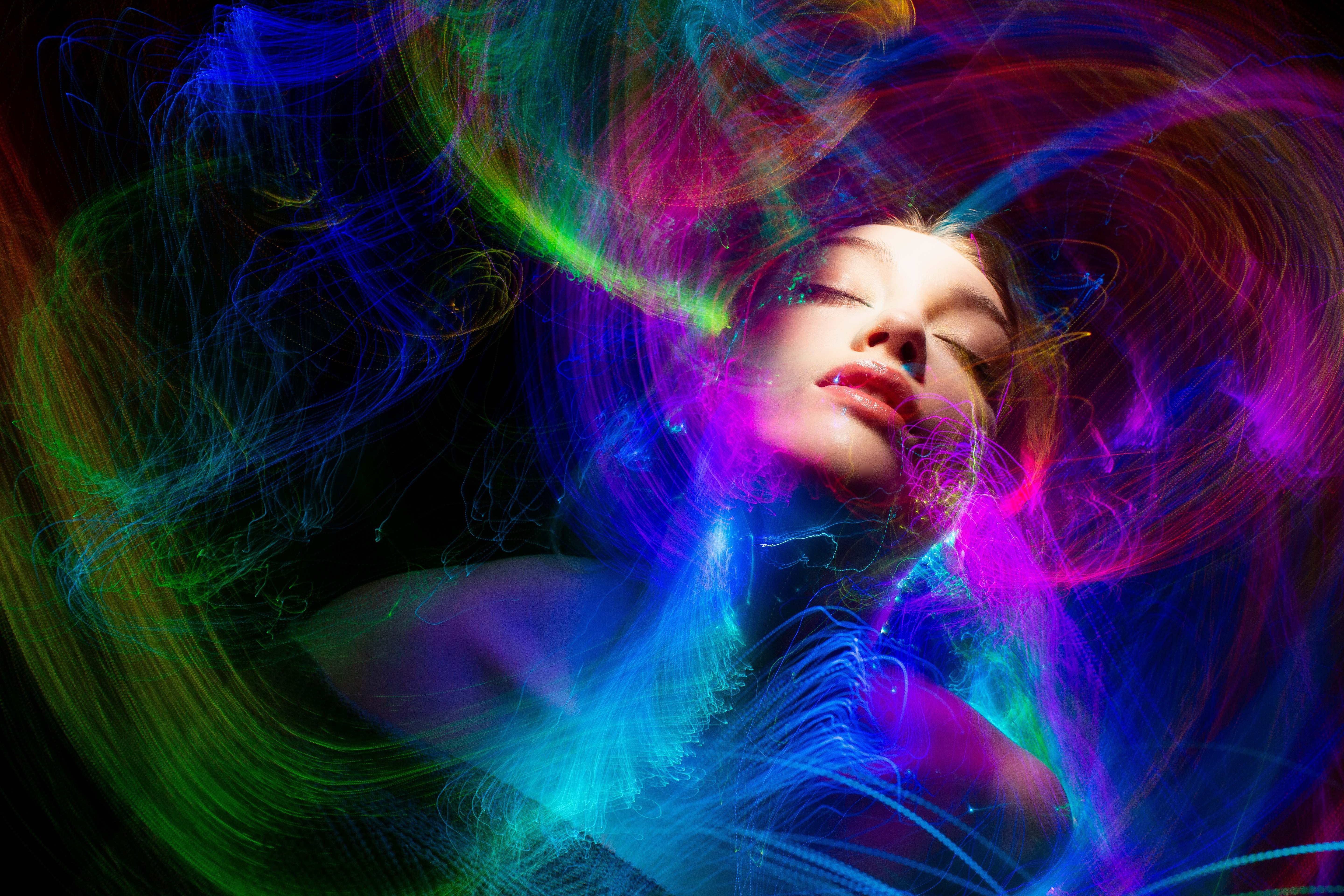 Description: A woman with her eyes closed and her head tilted to the side with a colorful background of light streaks.