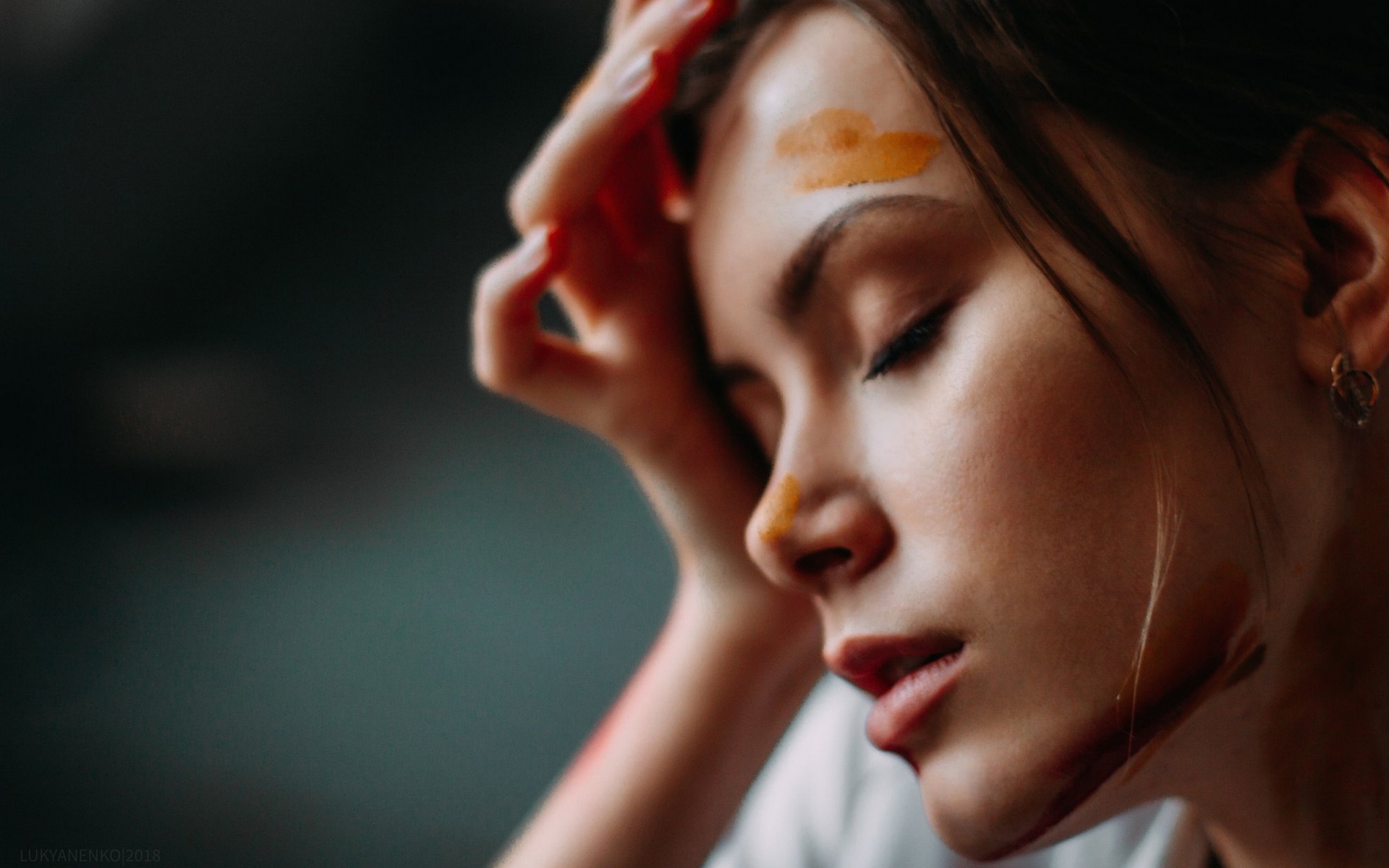 Description: A woman with her eyes closed and her hand on her head with a yellow substance on her cheek and her hand on her head.