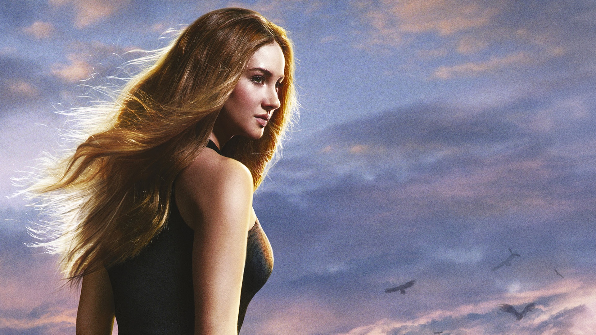 Description: A woman with long hair standing in front of a cloudy sky with birds flying overhead in the background.