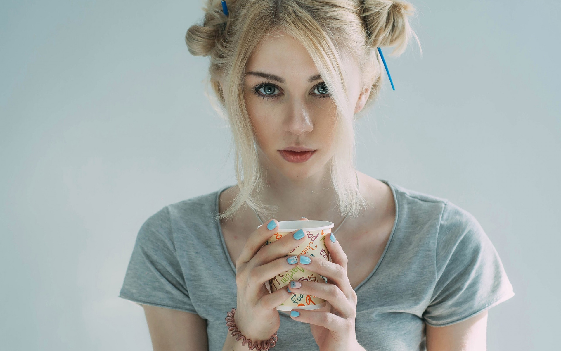 Description: A woman holding a cup of coffee and a donut in her hand with a bow in her hair.