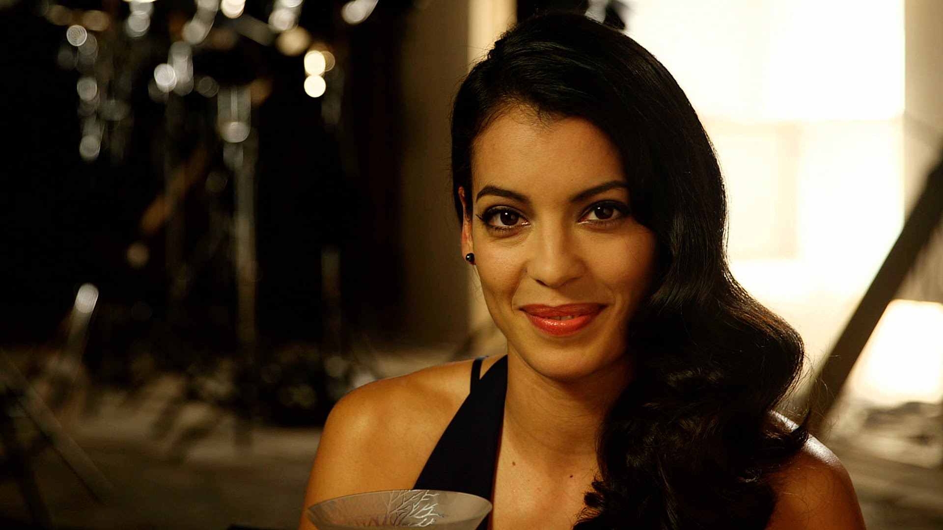 Description: A woman with a cup of coffee in her hand and a drum in the background.