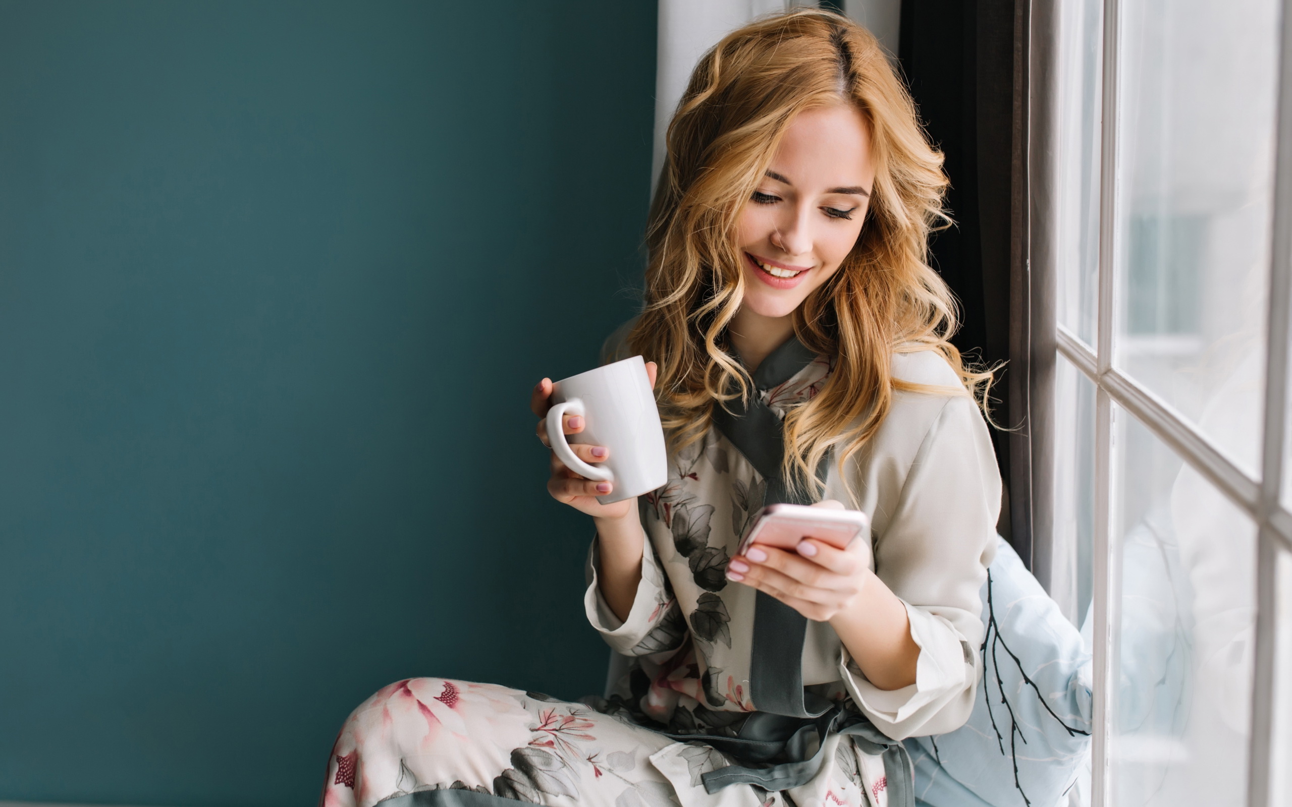 Description: A woman sitting on a window sill holding a cup of coffee and looking at her phone while holding a cell phone.