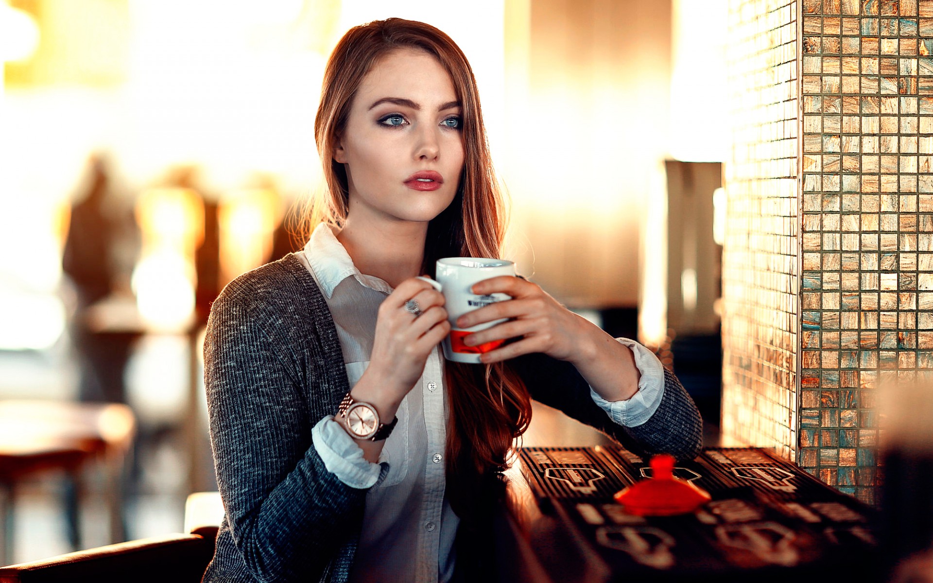 Description: A woman holding a cup of coffee in a restaurant or bar with a tiled wall behind her and a tiled wall behind her.