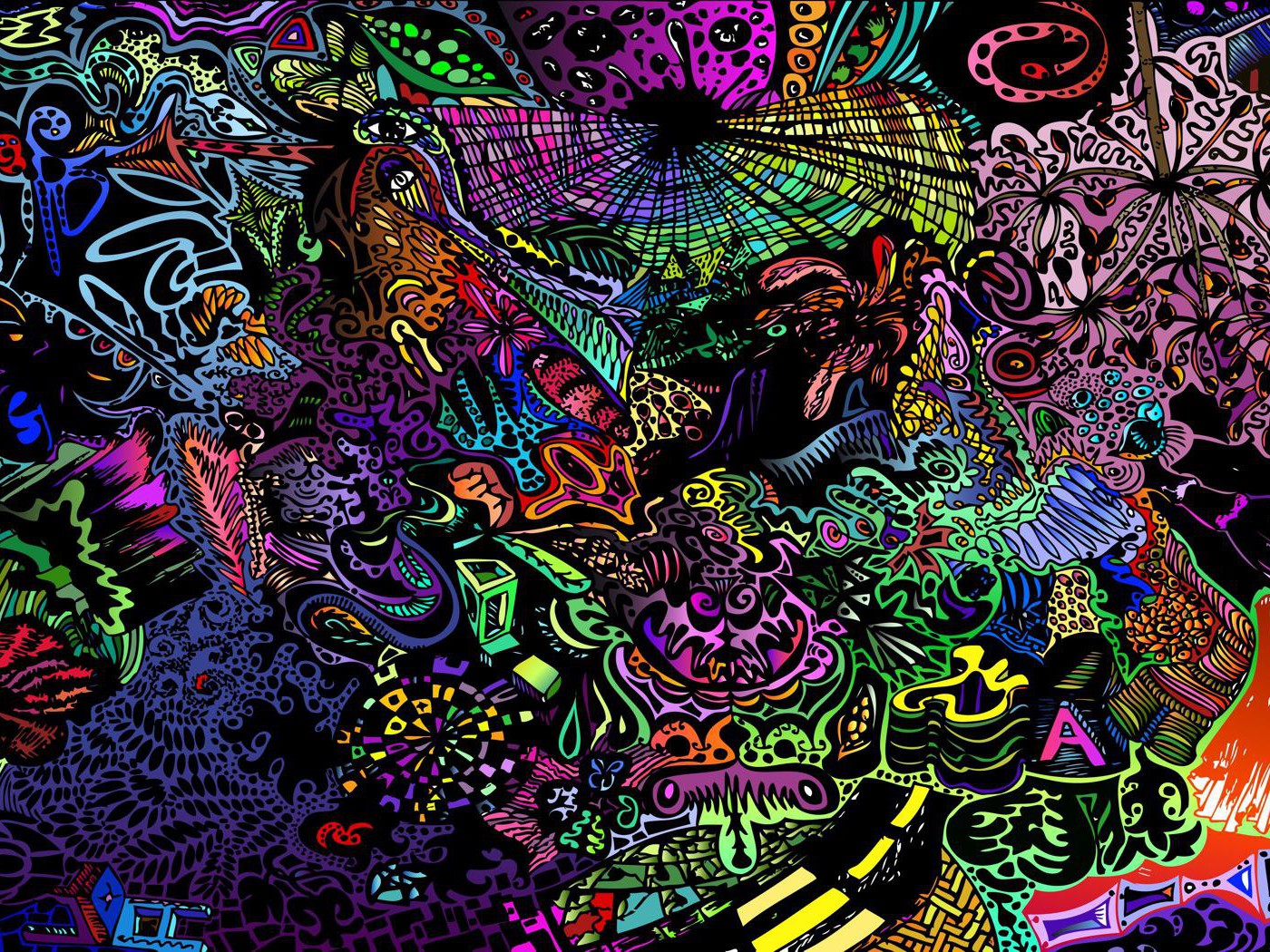 Description: A painting of a woman with a colorful background of flowers and leaves on a black background with a red.