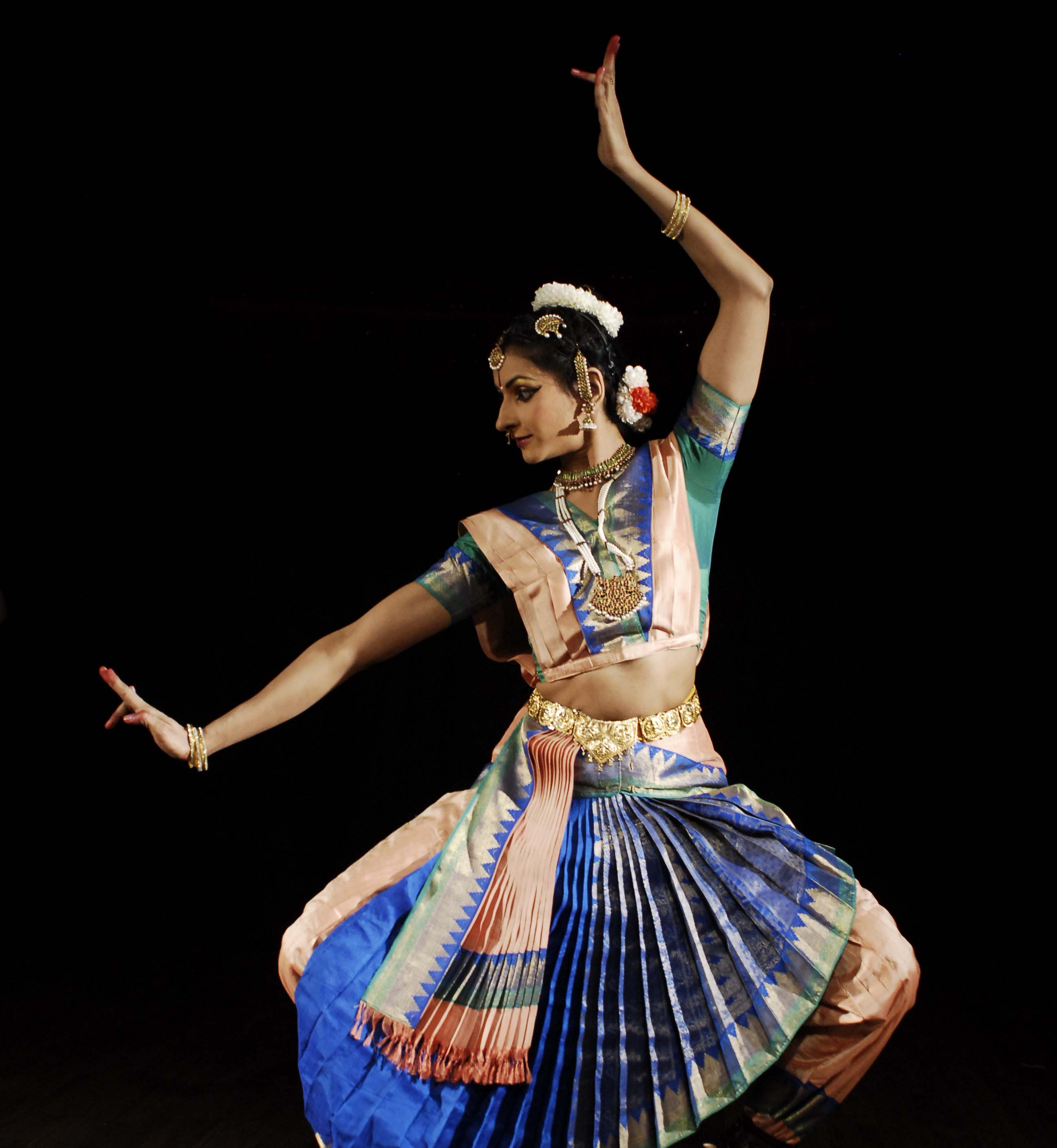 Description: A woman in a colorful dress dancing on stage with her arms out and hands out in the air.