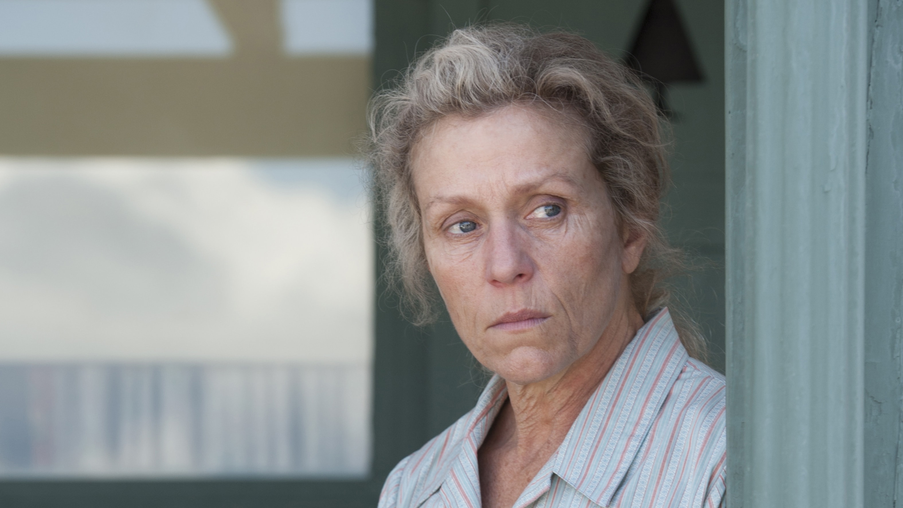 Description: A woman with a concerned look on her face looking out a window with a blue sky in the background.