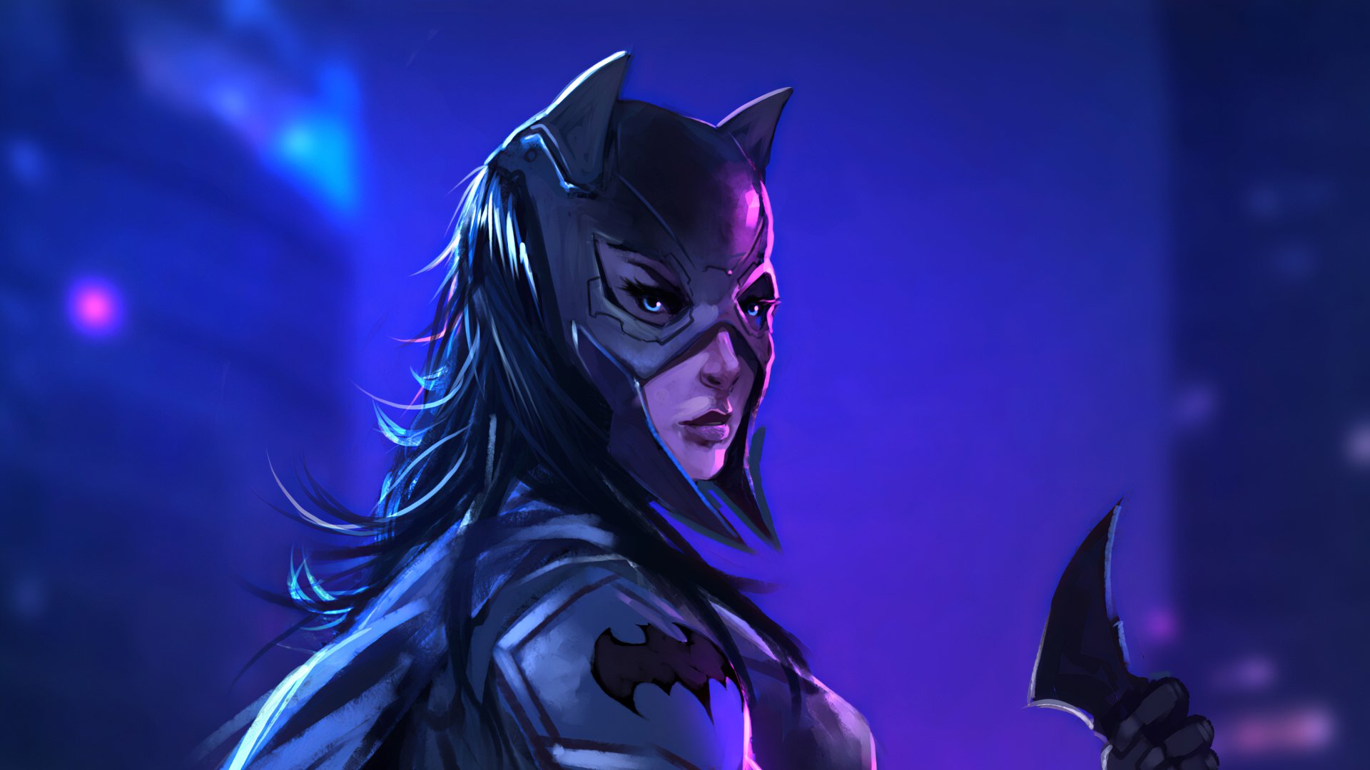 Description: A woman in a costume holding a bat in a dark city at night with a purple light behind her.