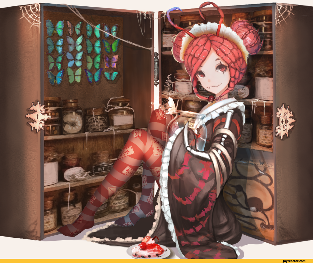 Description: A woman in a costume sitting in a cabinet with a knife in her hand and a knife in her hand.