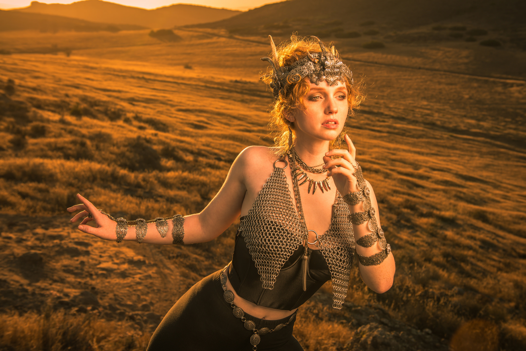 Description: A woman in a costume is standing in a field with a snake on her arm and a snake on her shoulder.