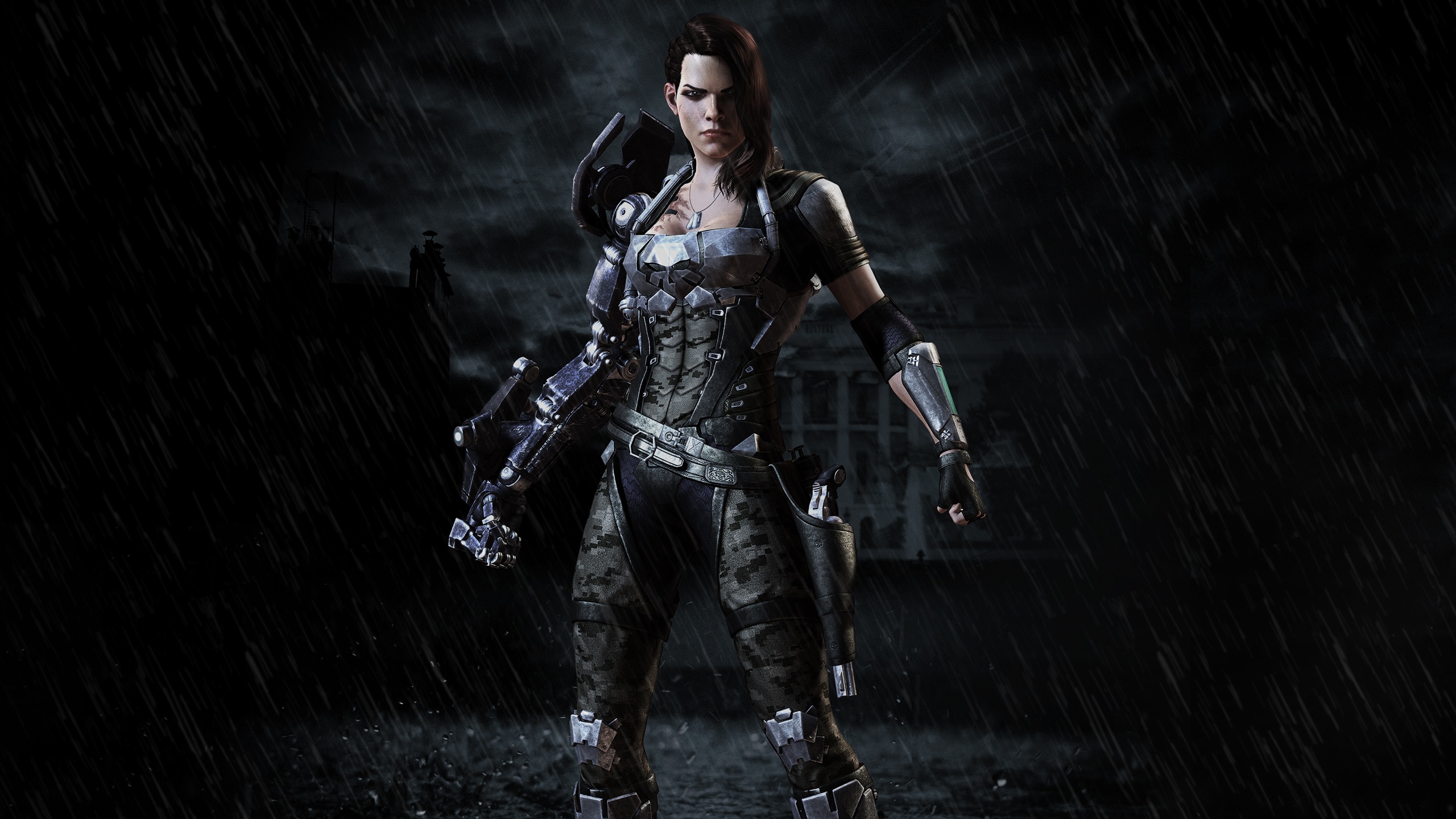Description: A woman in a costume holding a gun and a glove in the rain with a dark background and a building.