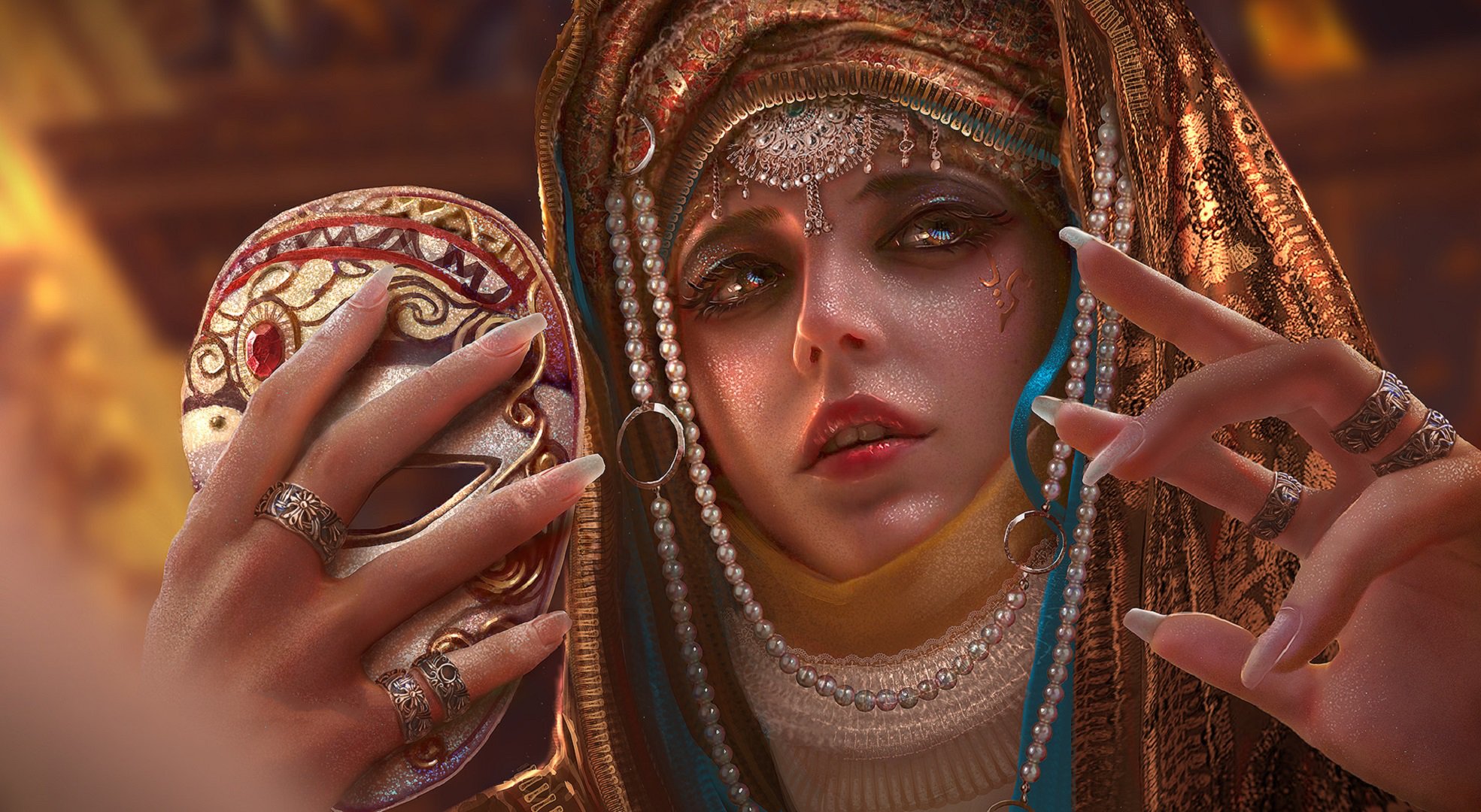 Description: A woman in a costume holding a mask and pointing to it's side with her finger in the air.