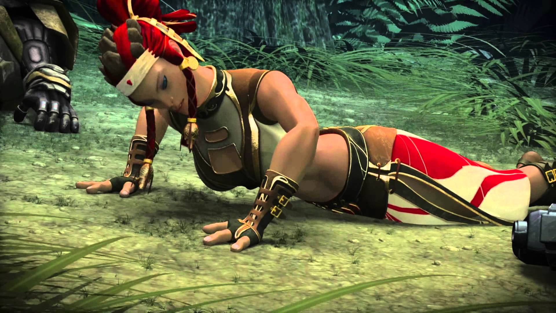 Description: A woman in a costume laying on the ground next to a robot in a forest with plants and grass.