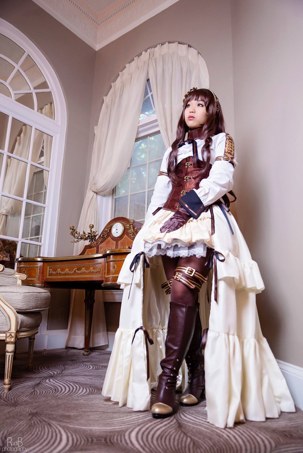 Description: A woman dressed in a costume standing in a room with a desk and chair in the background and a window.