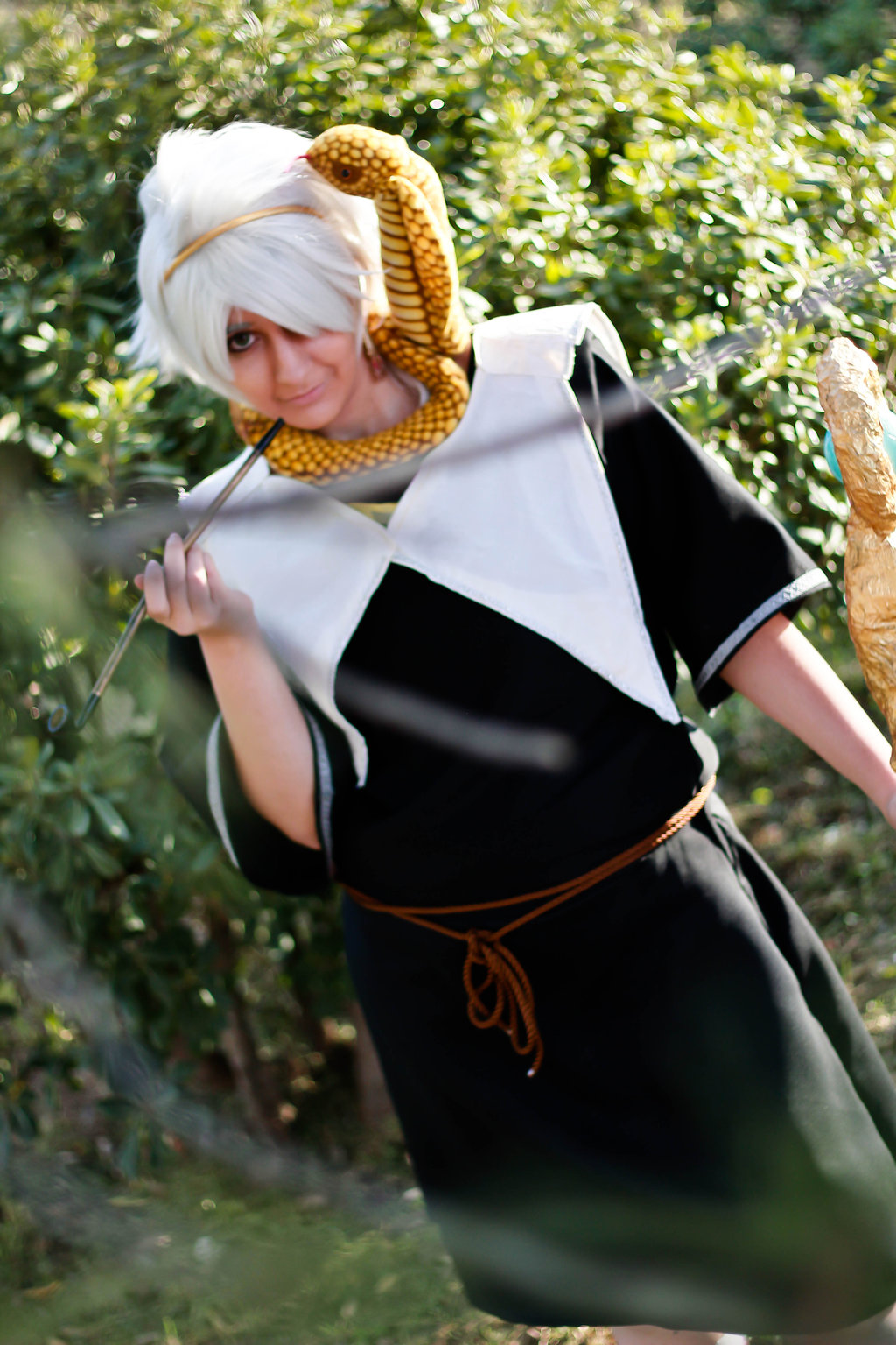 Description: A woman dressed in a costume holding a stick and a piece of bread in her hands and a hat on her head.