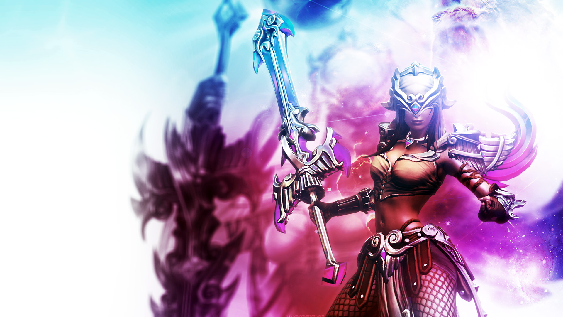 Description: A woman in a costume holding a sword and a sword in her hand with a background of blue and purple.