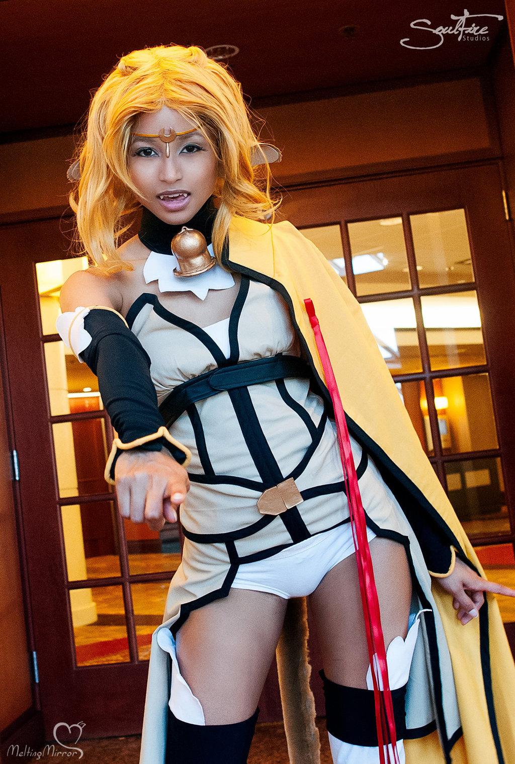 Description: A woman dressed in a costume with a sword and a cape on her head and a sword in her hand.