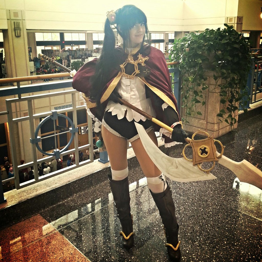 Description: A woman dressed in a costume holding a sword and a sword blade in a lobby area of a building.