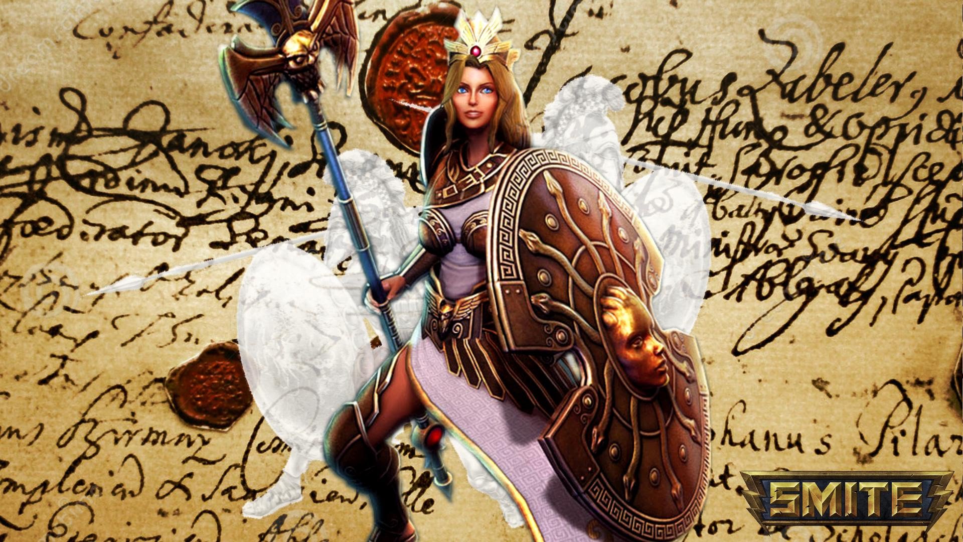 Description: A woman in a costume holding a sword and a shield on a map of the world with writing on it.
