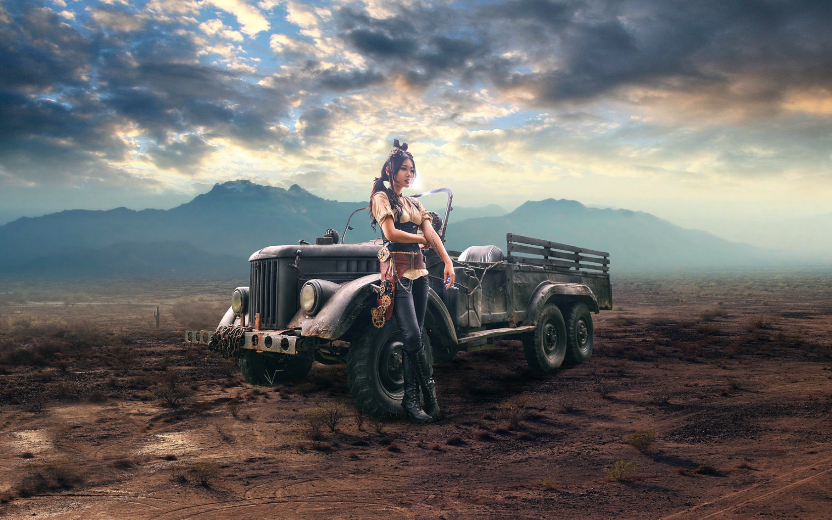 Description: A woman in a costume is sitting on a truck in the desert with a gun in her hand and a bird on her shoulder.