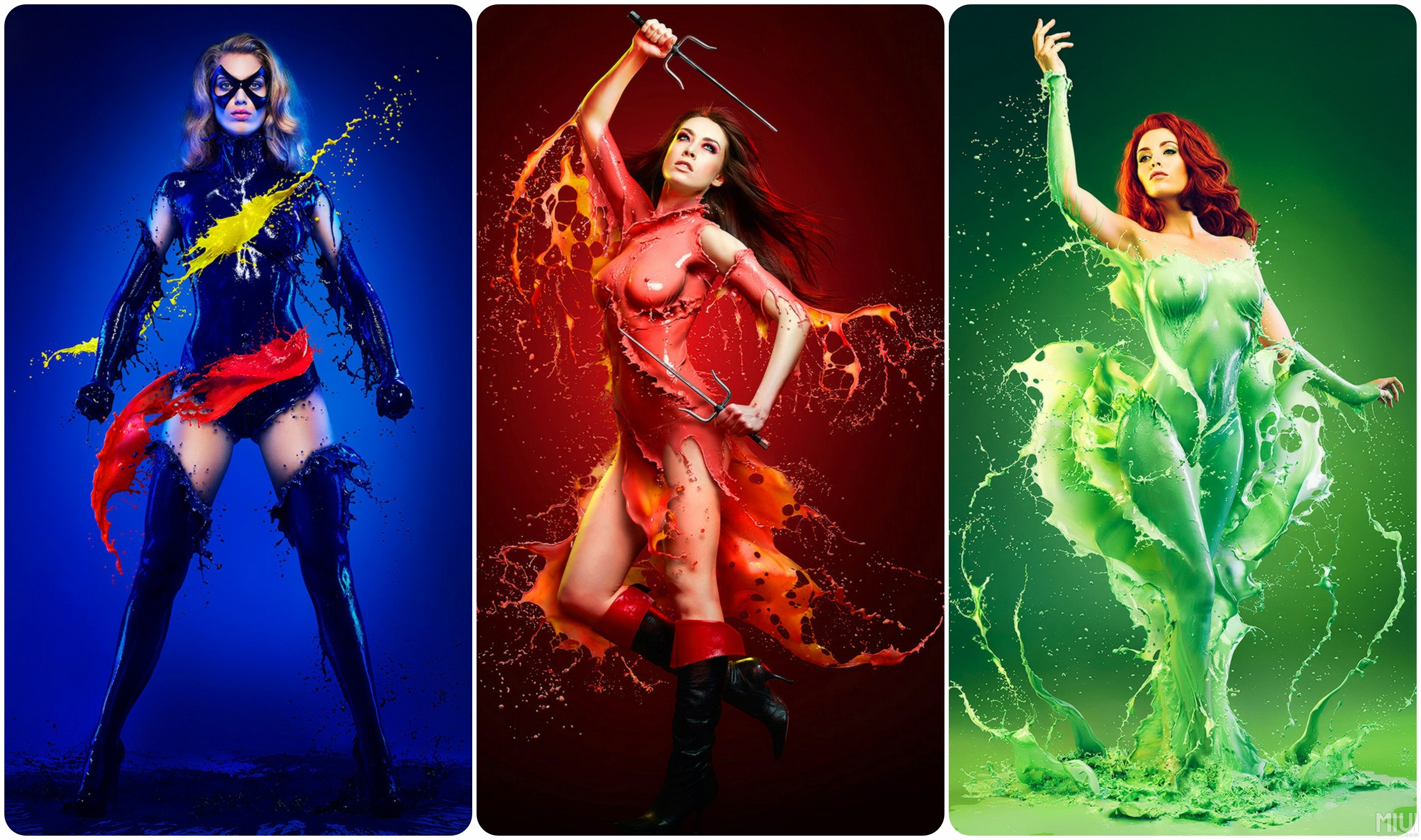 Description: Three different photos of a woman in different costumes and colors.