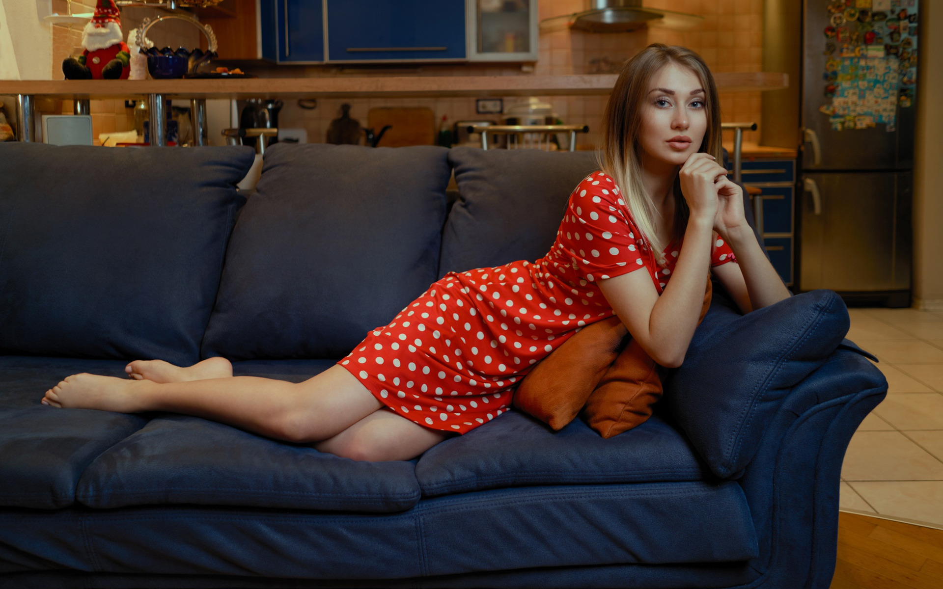 Description: A woman sitting on a couch in a room with a blue couch and a blue couch with a red polka dot dress.