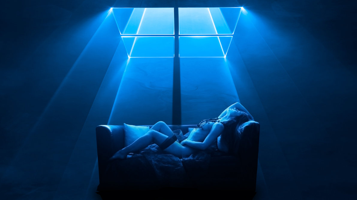 Description: A woman is laying on a couch in a room with a blue light coming from the window and a blue light coming from the ceiling.