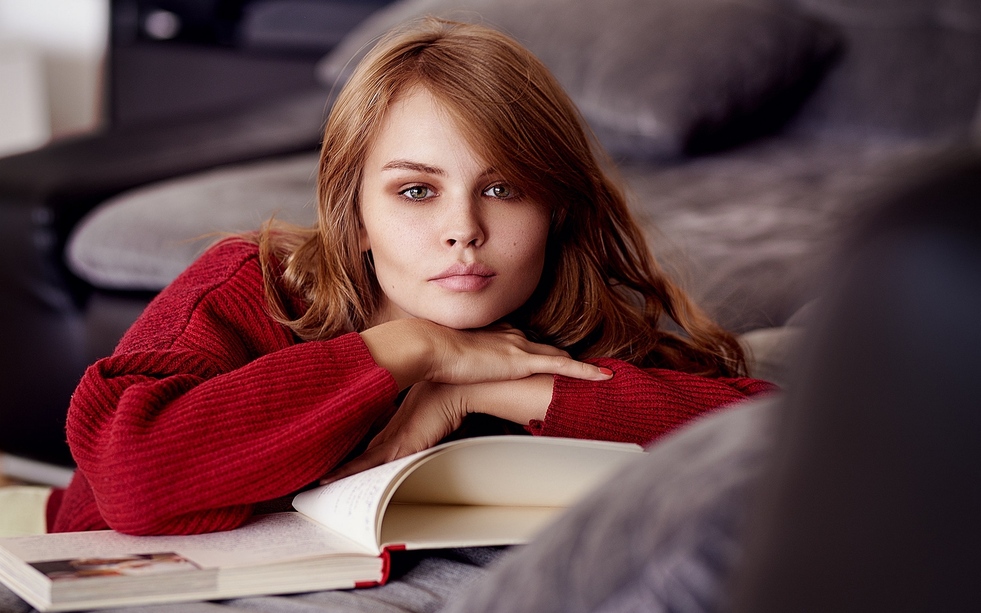 Description: A woman laying on a couch with a book in her hand and looking at the camera with a serious look on her face.