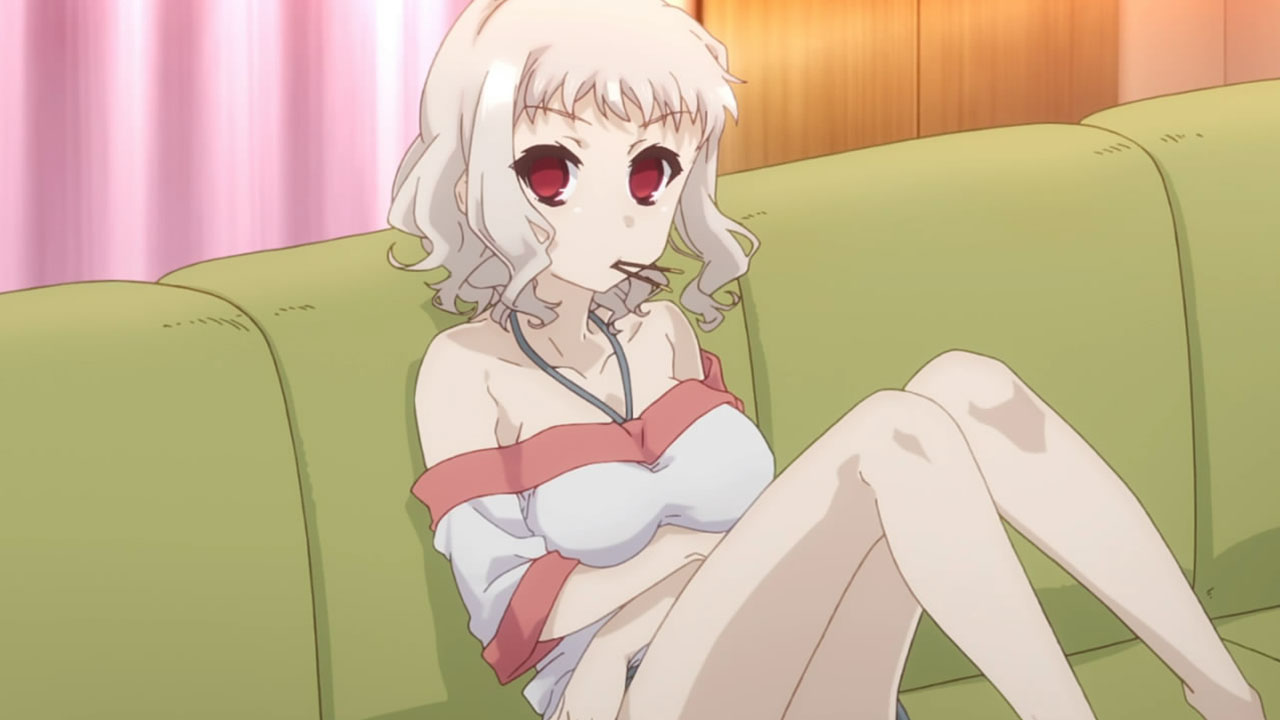 Description: A woman sitting on a couch with her legs crossed and her legs crossed.