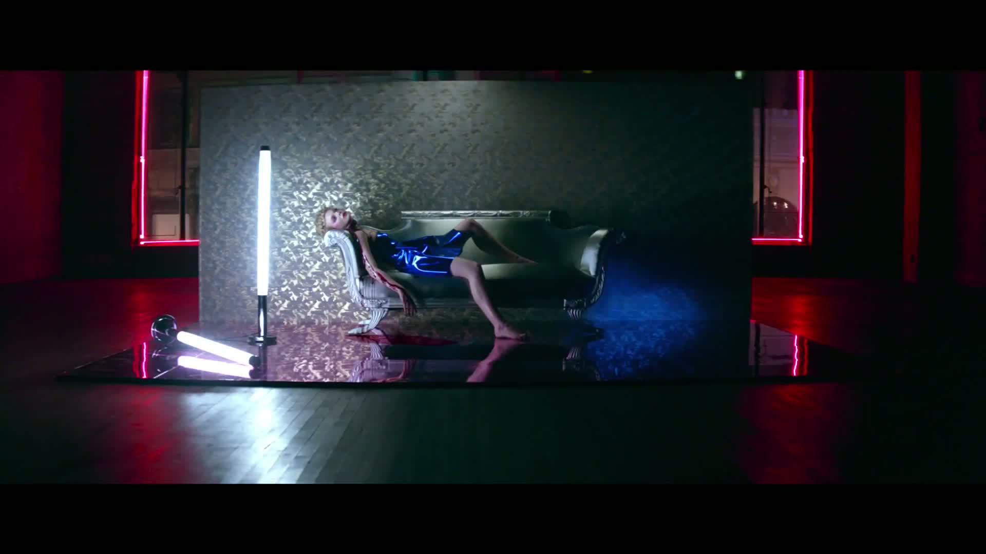 Description: A woman sitting on a couch in a dark room with a red light coming from behind her and a mirror reflecting her.