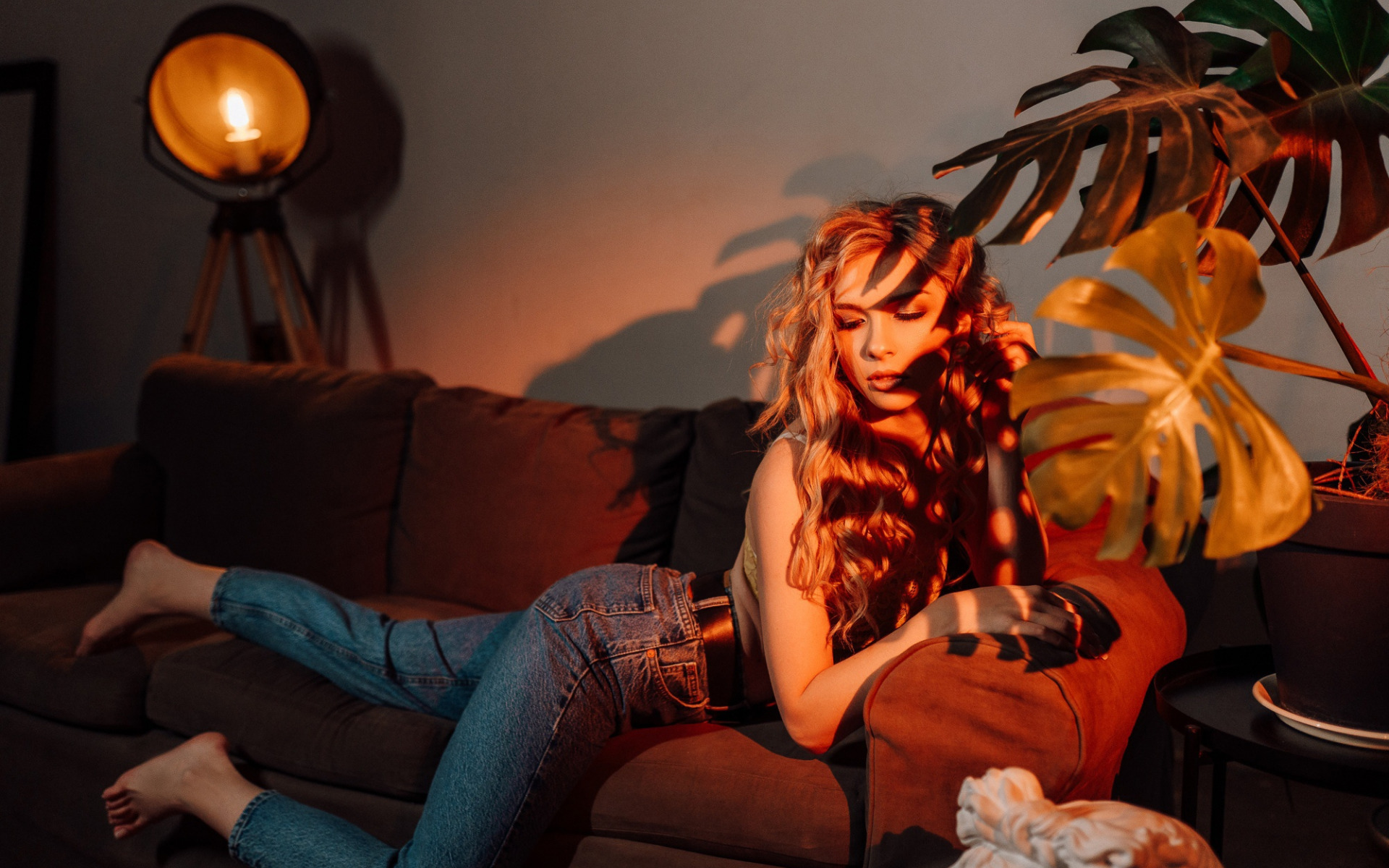 Description: A woman sitting on a couch with a hair dryer in her hand and a plant in the background.