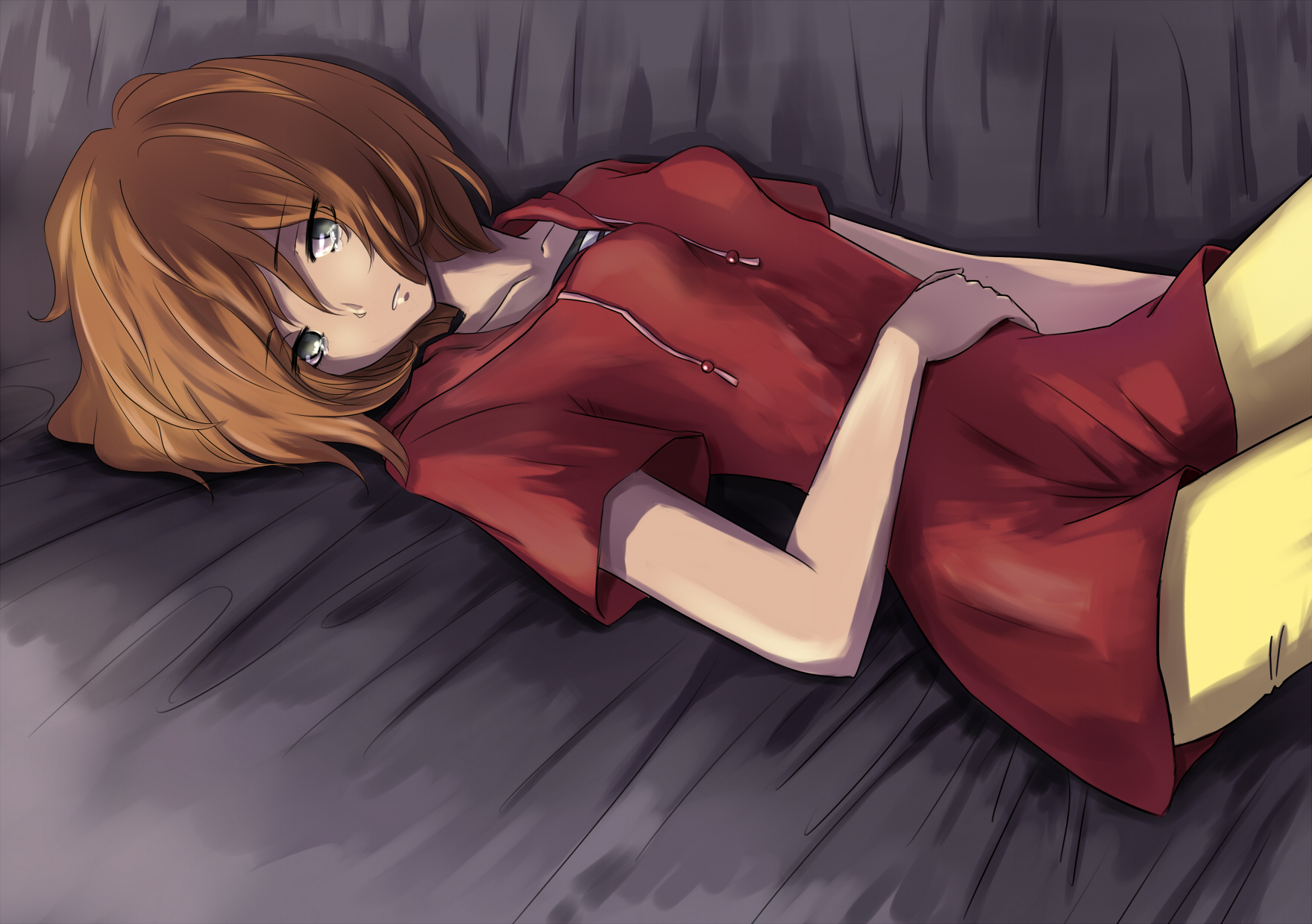 Description: A woman laying on a couch with her head on her hand and a cell phone in her hand.