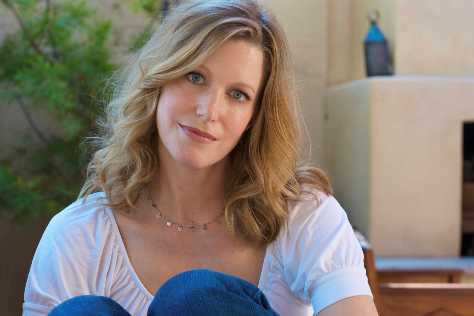 Description: A woman sitting on a couch in a living room with a fireplace in the background and a tv in the background.