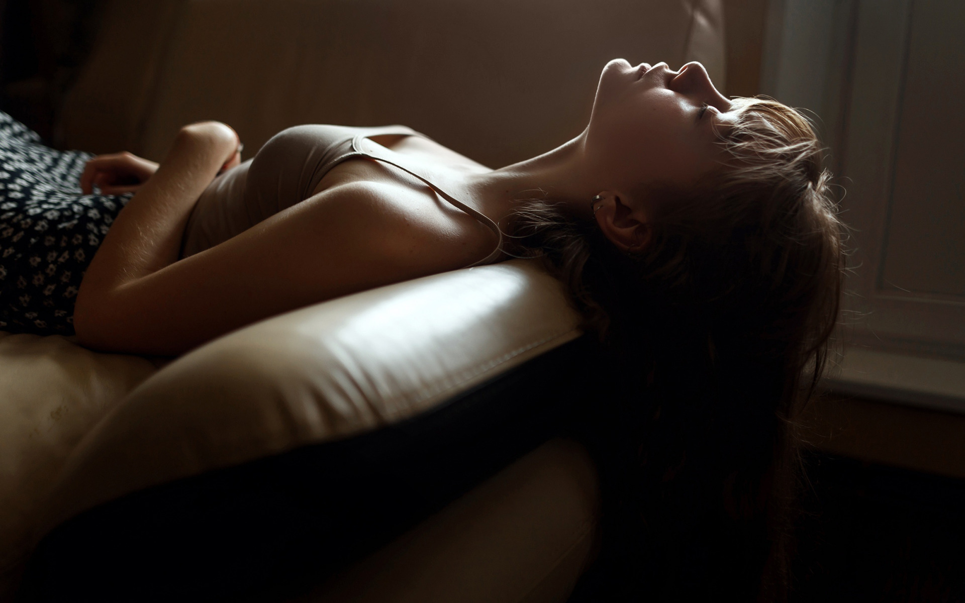 Description: A woman laying on a couch with her eyes closed and her head resting on the pillow of the couch.