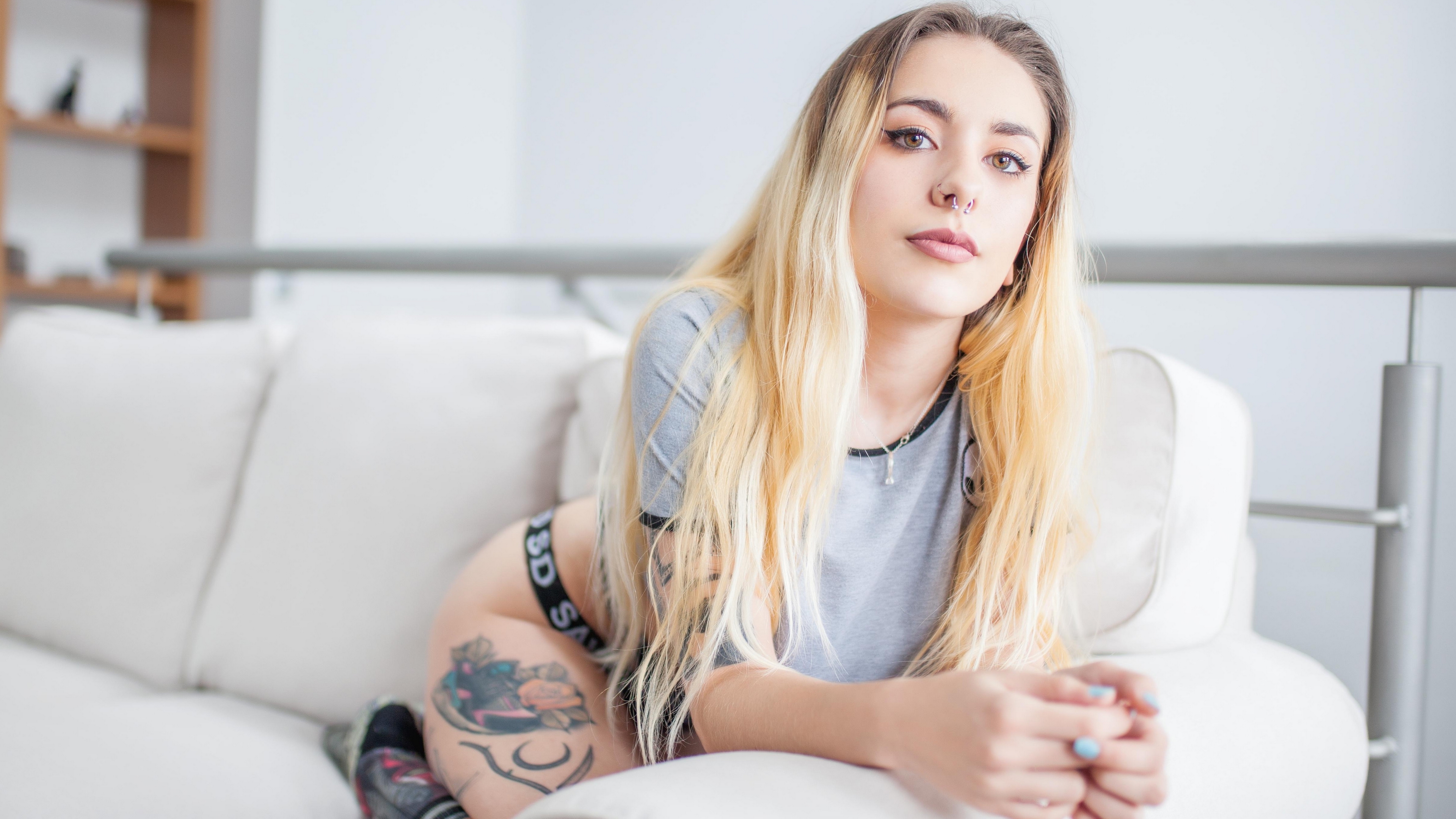 Description: A woman sitting on a couch with a tattoo on her arm and a tattoo on her leg.
