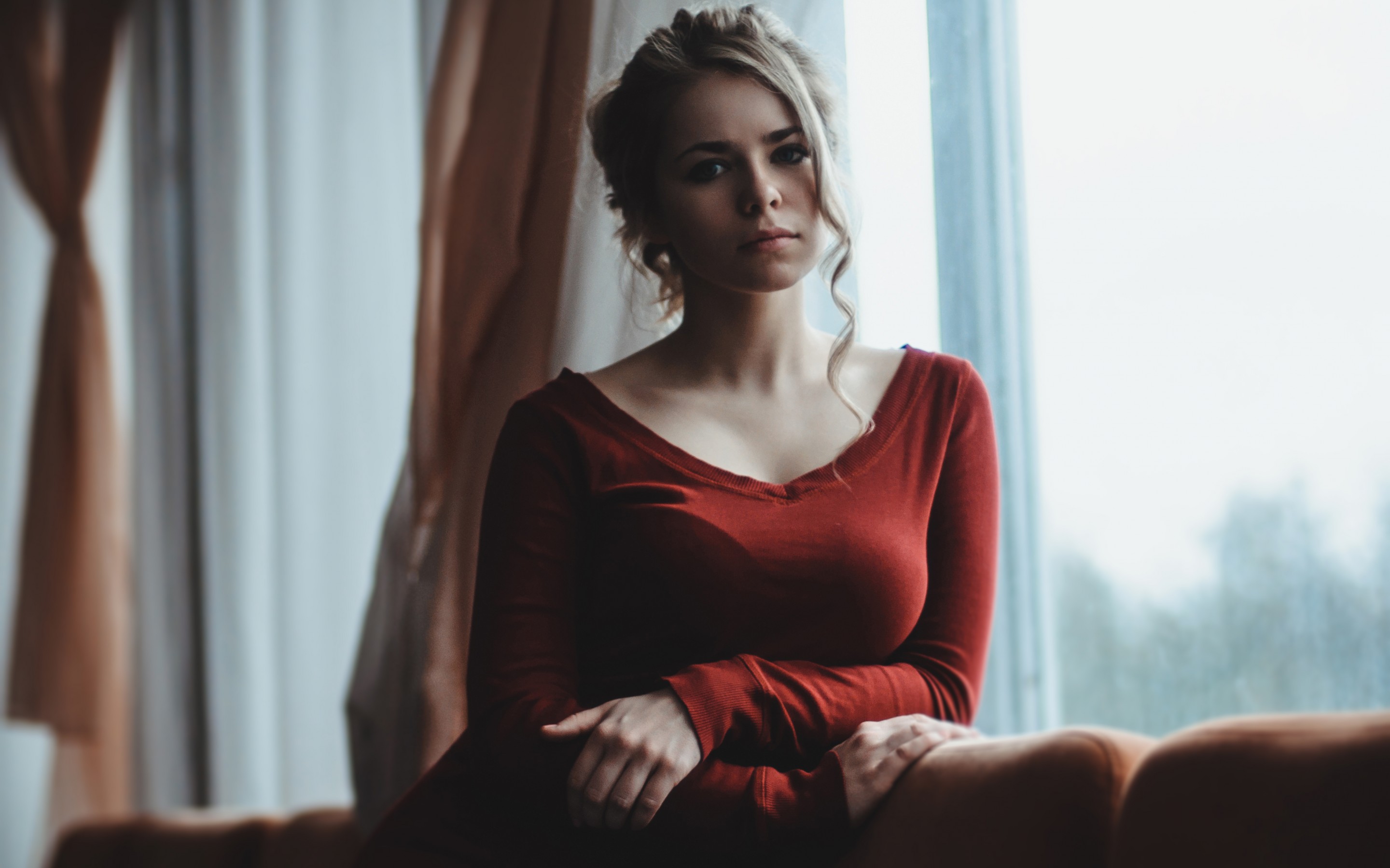 Description: A woman sitting on a couch in front of a window with her hands on her hips and looking at the camera.