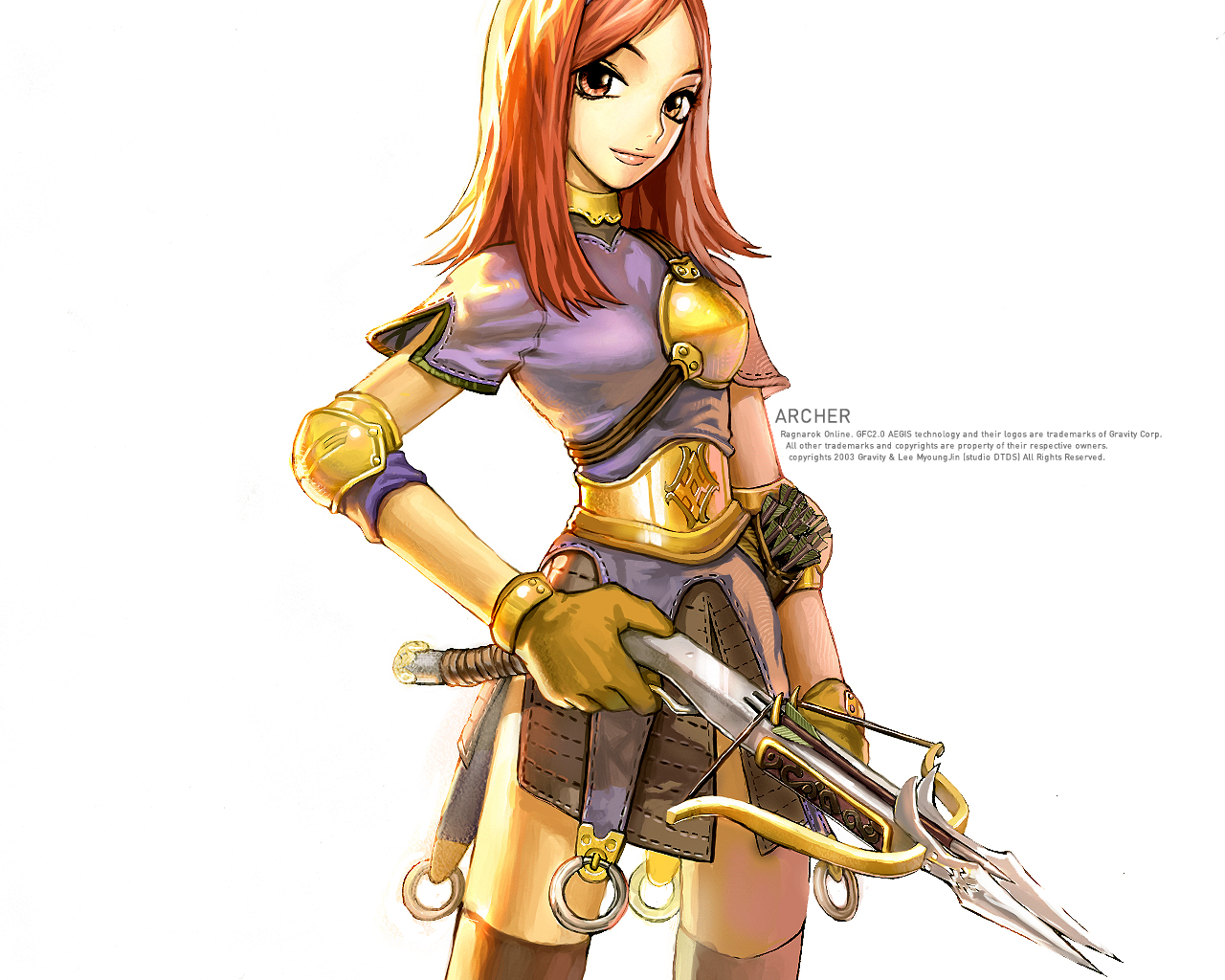 Description: A woman in a costume holding two swords and a sword in her hand.