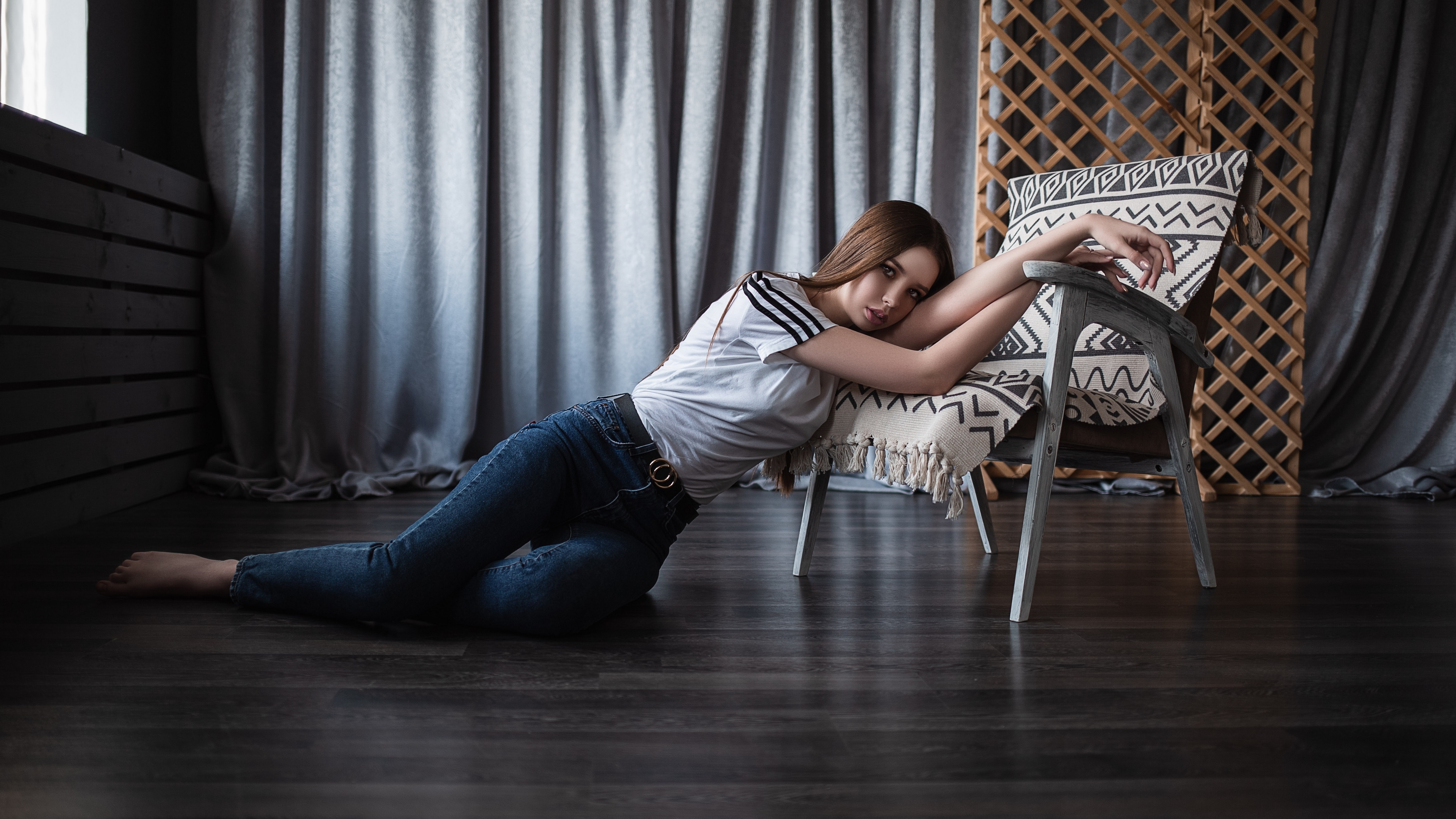 Description: A woman is sitting on the floor with her legs crossed and her head on a chair and her arm on the floor.