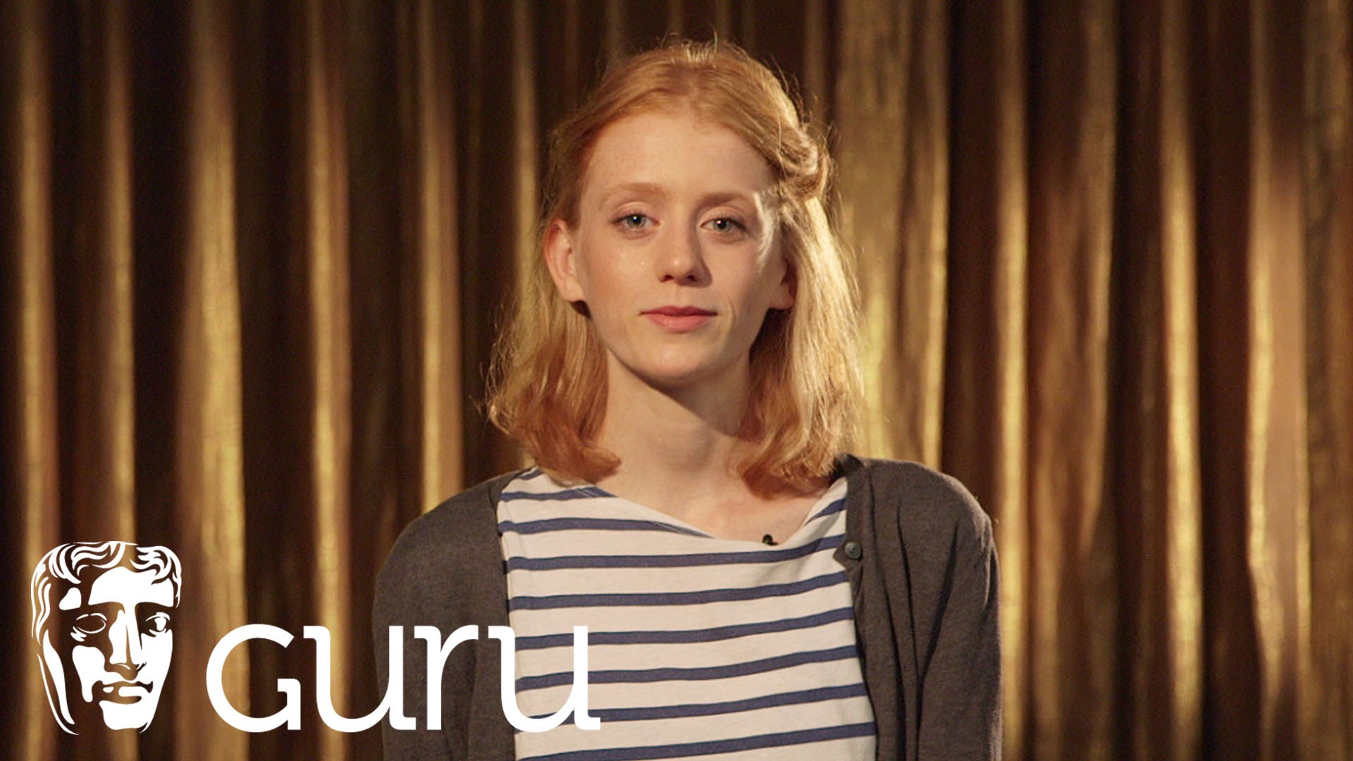 Description: A woman standing in front of a curtain with a name on it that says guru on it and a picture of a man in a striped shirt.