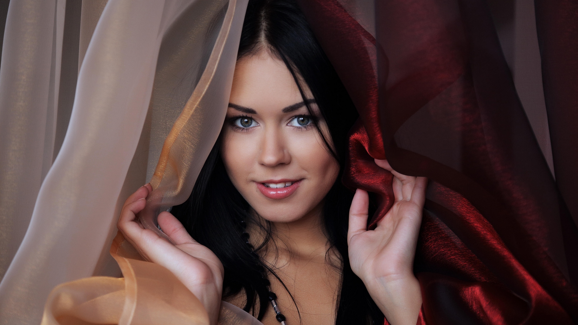 Description: A woman is posing behind a curtain with her hands on her head and her eyes closed.