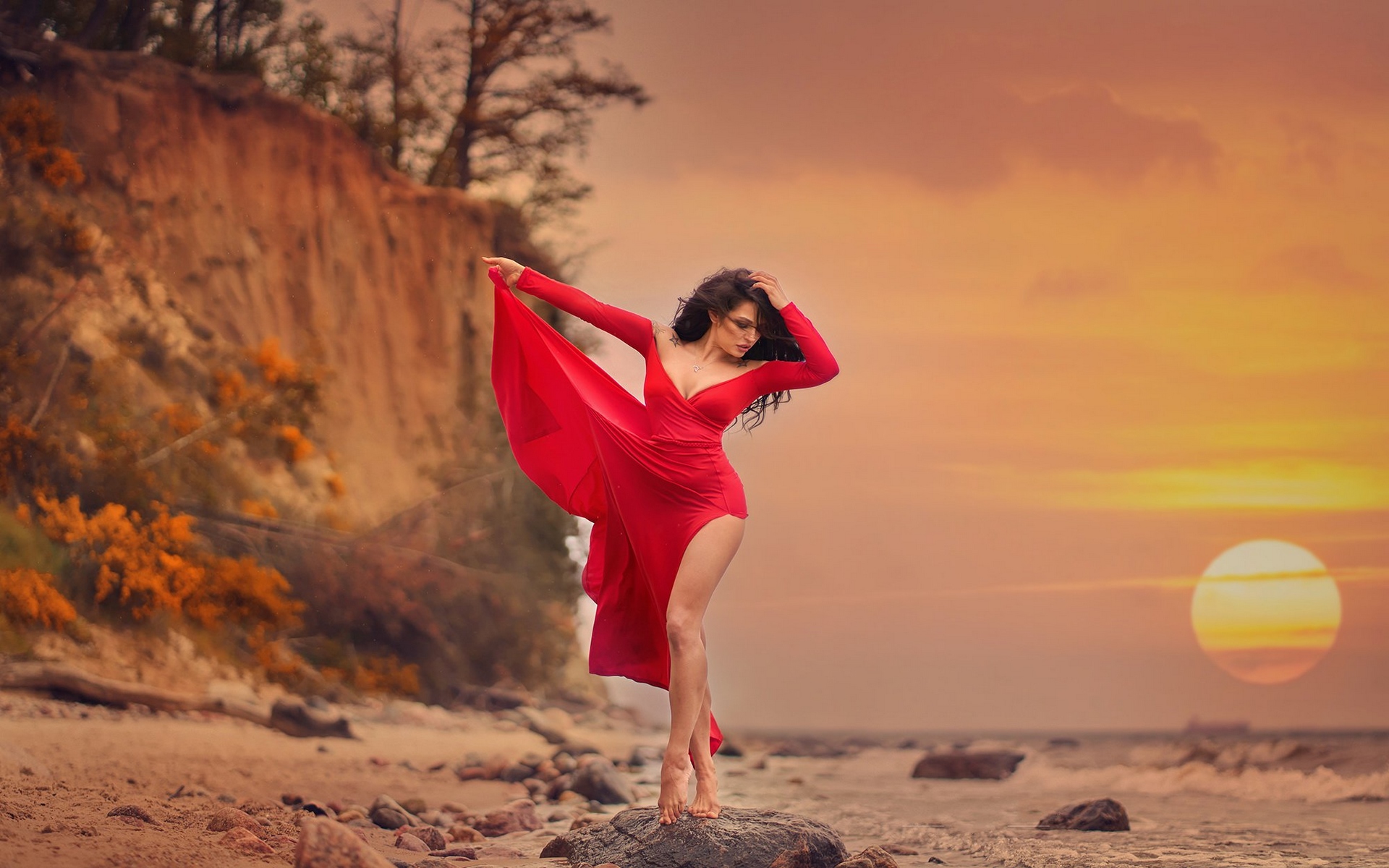 Description: A woman in a red dress is dancing on the beach at sunset with a red dress on her body.