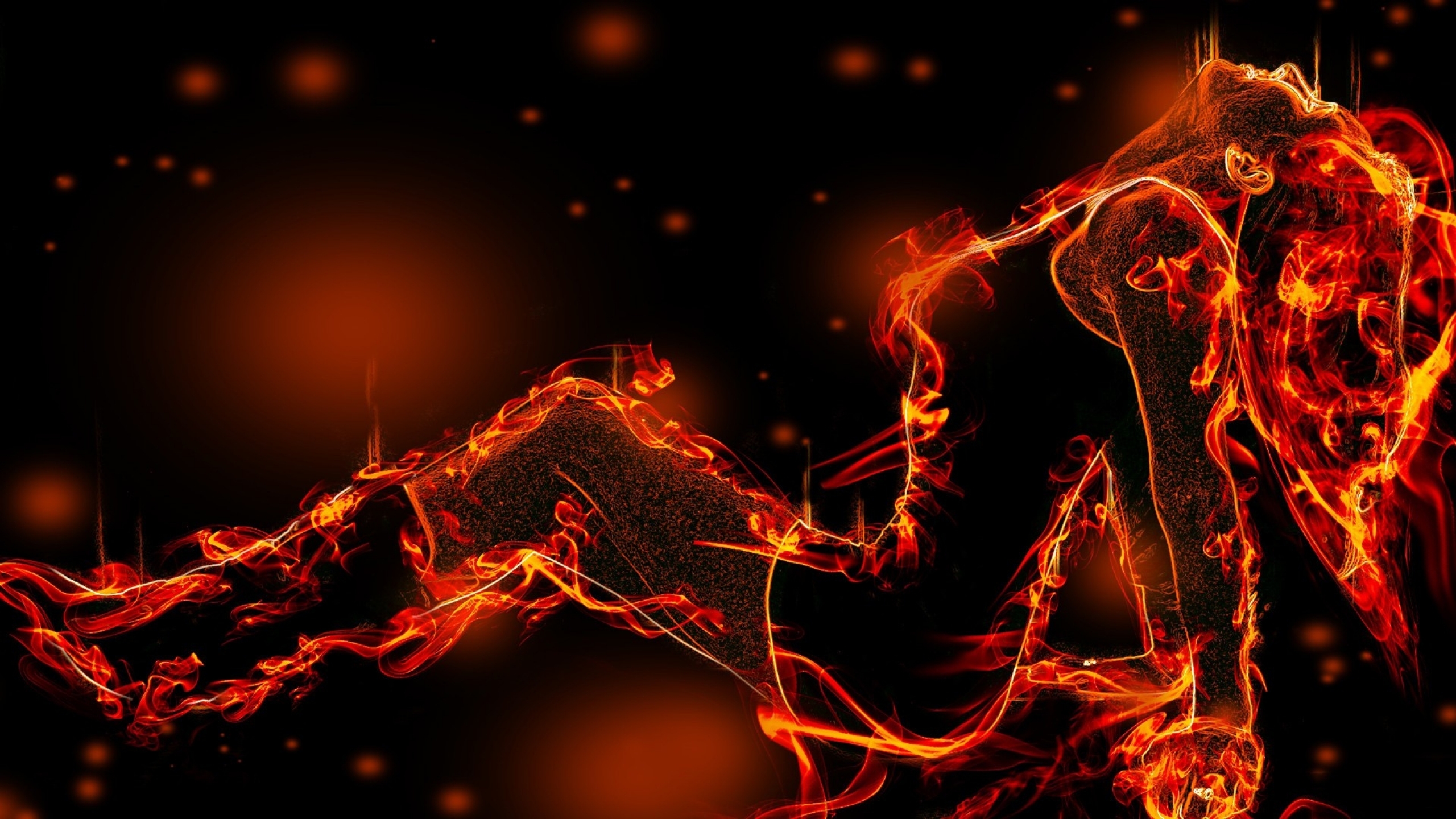 Description: A woman is dancing with fire in the air and her hair is blowing in the wind and her face is glowing.