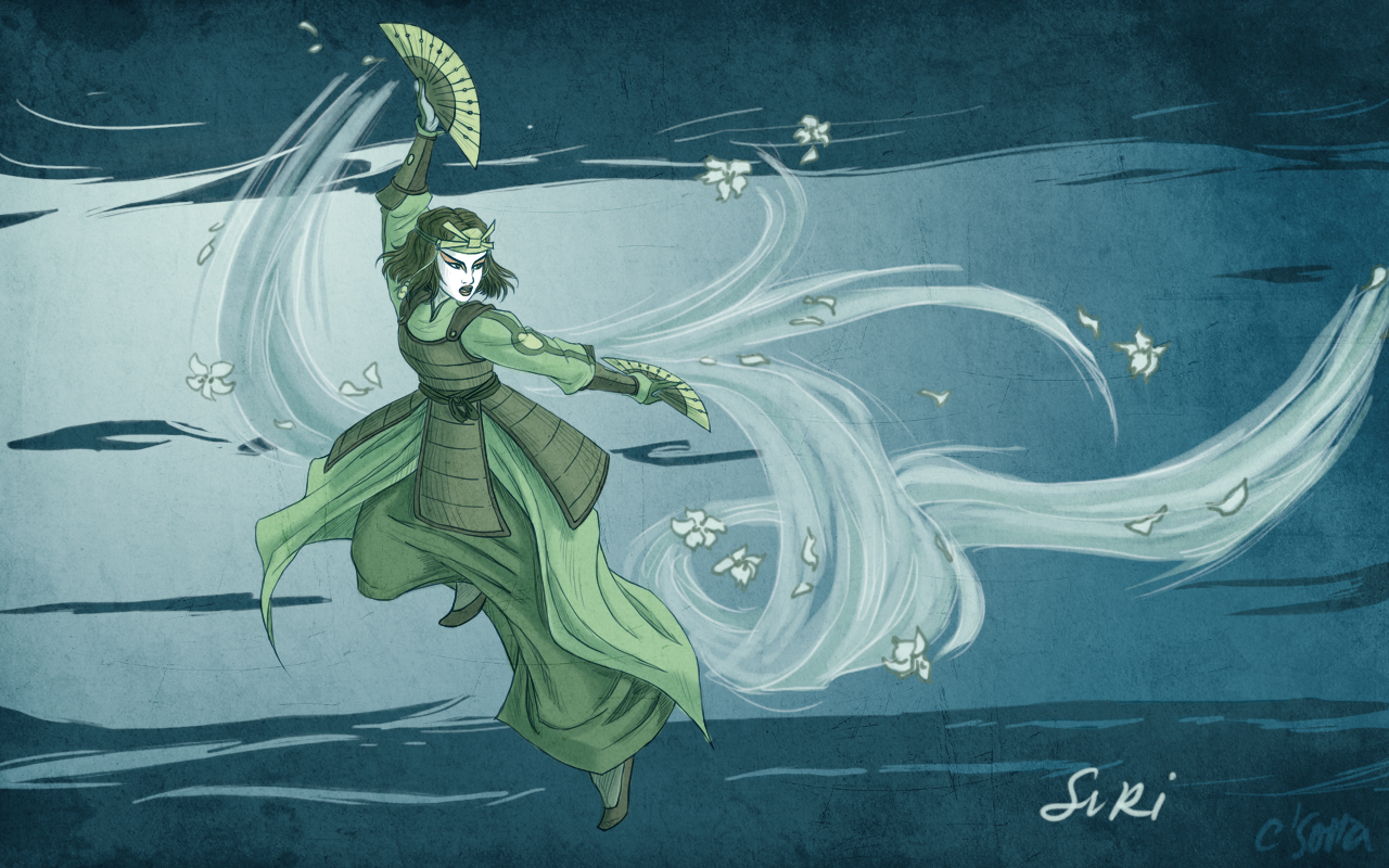 Description: A woman in a green dress is dancing in the water with a long white hair and a green headband.