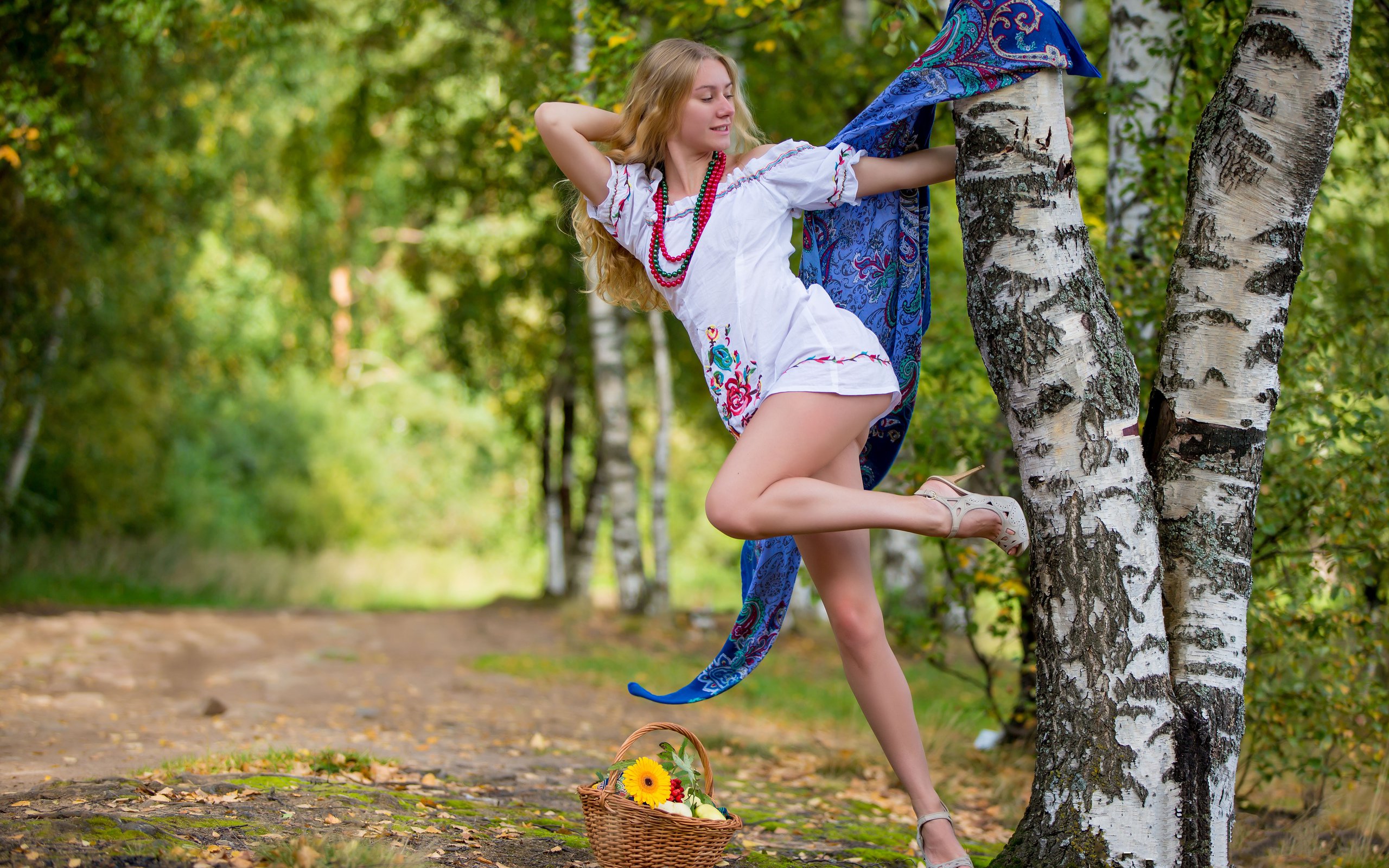 Description: A woman in a white dress is dancing in the woods with a blue scarf around her neck and a basket of fruit in her hand.