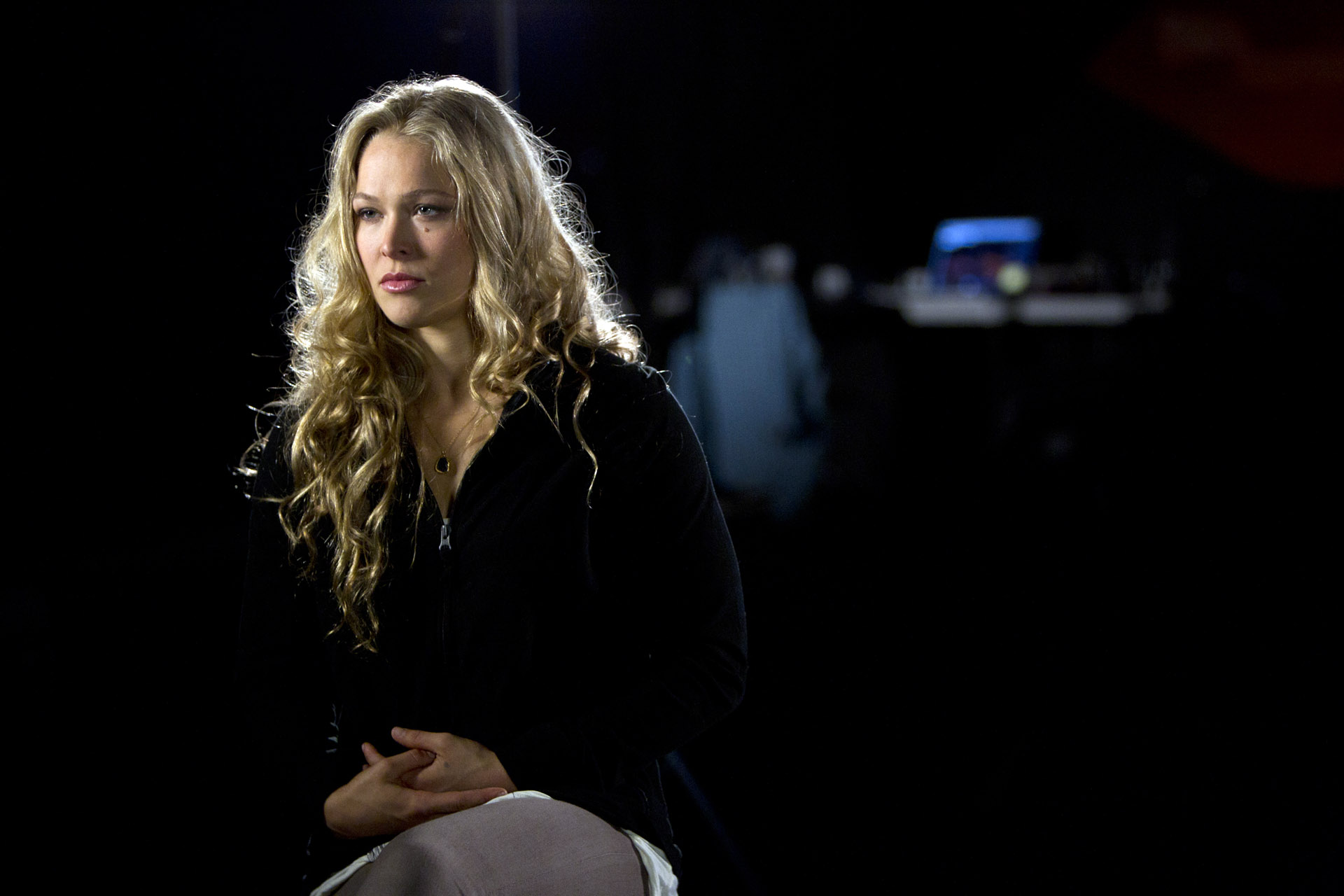 Description: A woman standing in the dark with her hands on her hips and a guitar case in her hand.