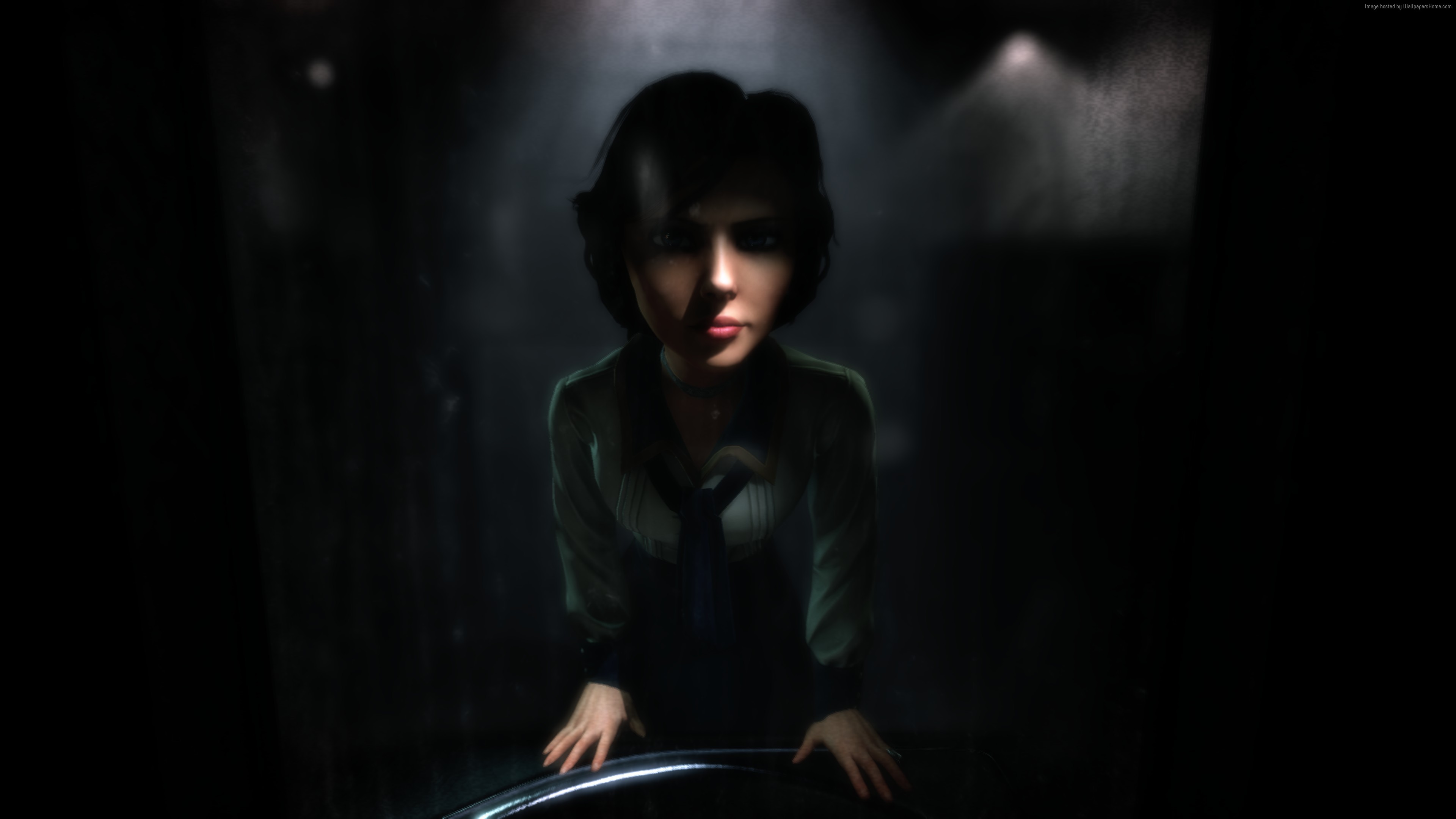 Description: A woman standing in a dark room with a light on her head and a mirror behind her.