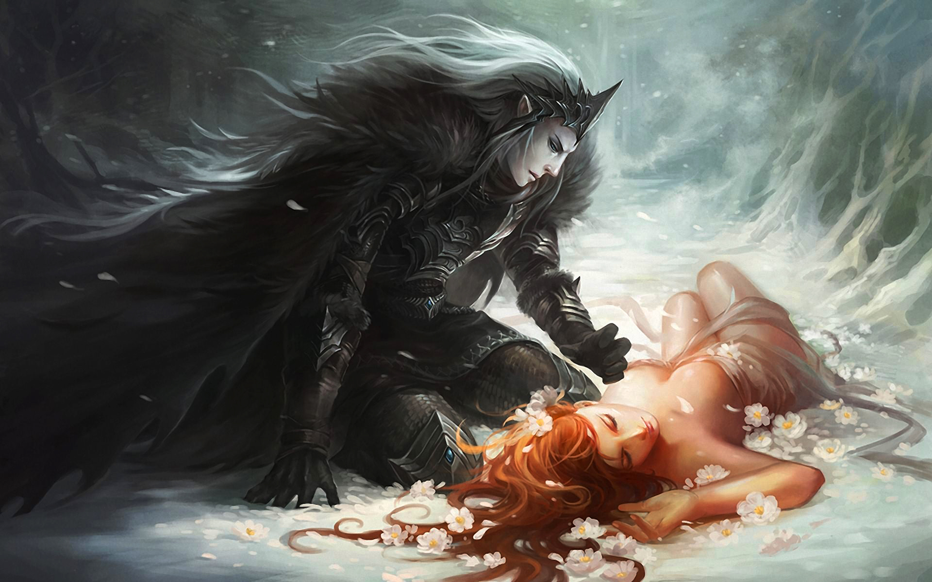 Description: A woman laying on the ground next to a demon in the snow with a knife in her hand and a demon in the background.