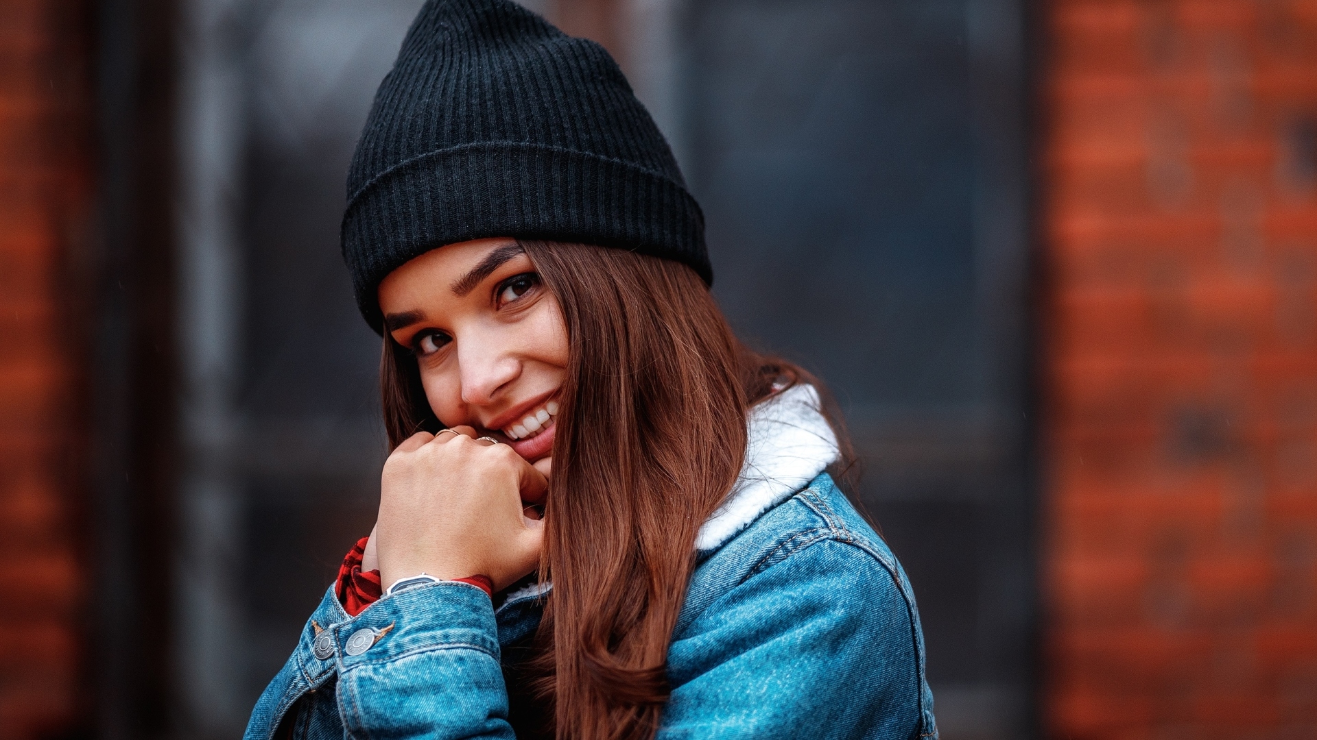 Description: A woman wearing a denim jacket and a beanie smiles at the camera while standing in front of a brick building.